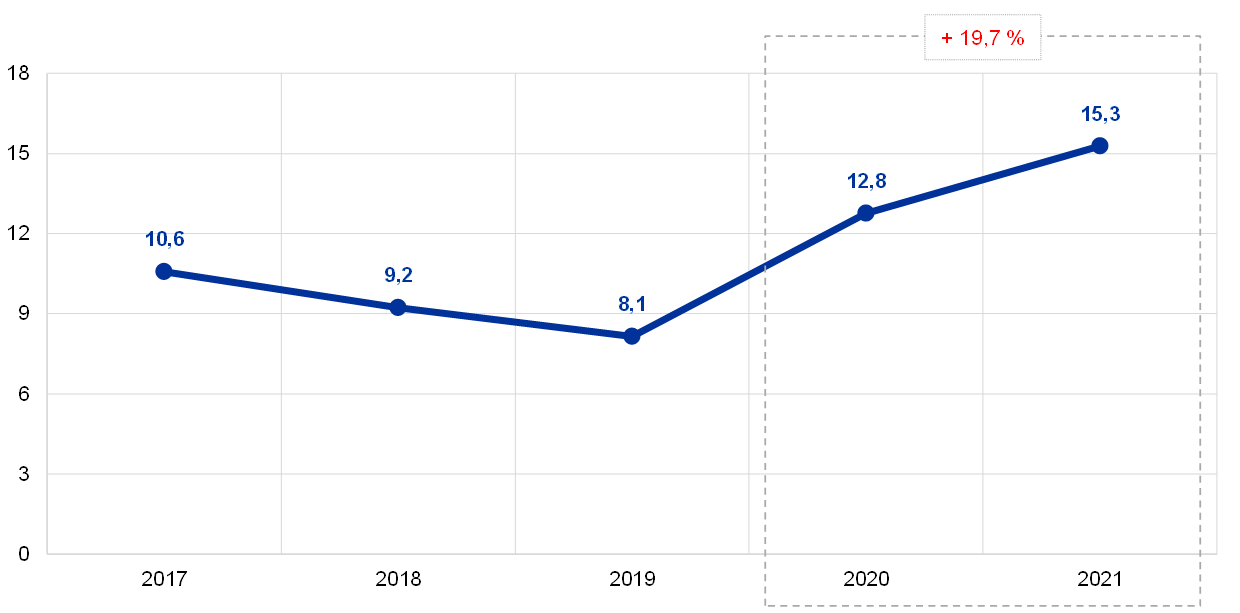 Fin 2021, la valeur totale des billets en euros en circulation s’élevait à 1 544,4 milliards d’euros, en hausse de 8 % par rapport à fin 2020. La part attribuée à la BCE de la valeur totale des billets en euros en circulation est de 8 %, soit 123,6 milliards d’euros à la fin de l’année. Étant donné que la BCE n’émet pas de billets elle-même, elle détient des créances intra-Eurosystème vis-à-vis des BCN de la zone euro pour une valeur équivalente à la valeur des billets en circulation.