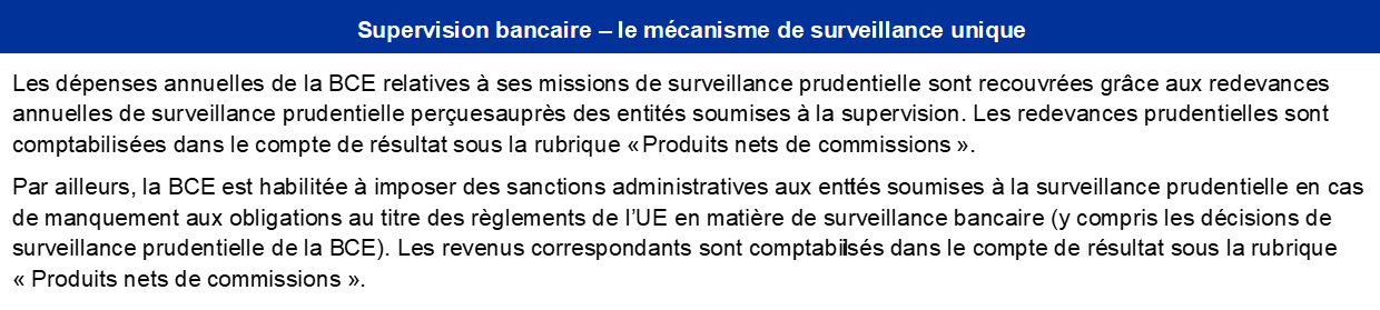 - Les dépenses engagées par la BCE pour l’accomplissement de ses missions de surveillance prudentielle sont recouvrées grâce aux redevances annuelles perçues auprès des entités soumises à la supervision. De plus amples informations sont disponibles sur le site internet de la BCE consacré à la supervision bancaire.