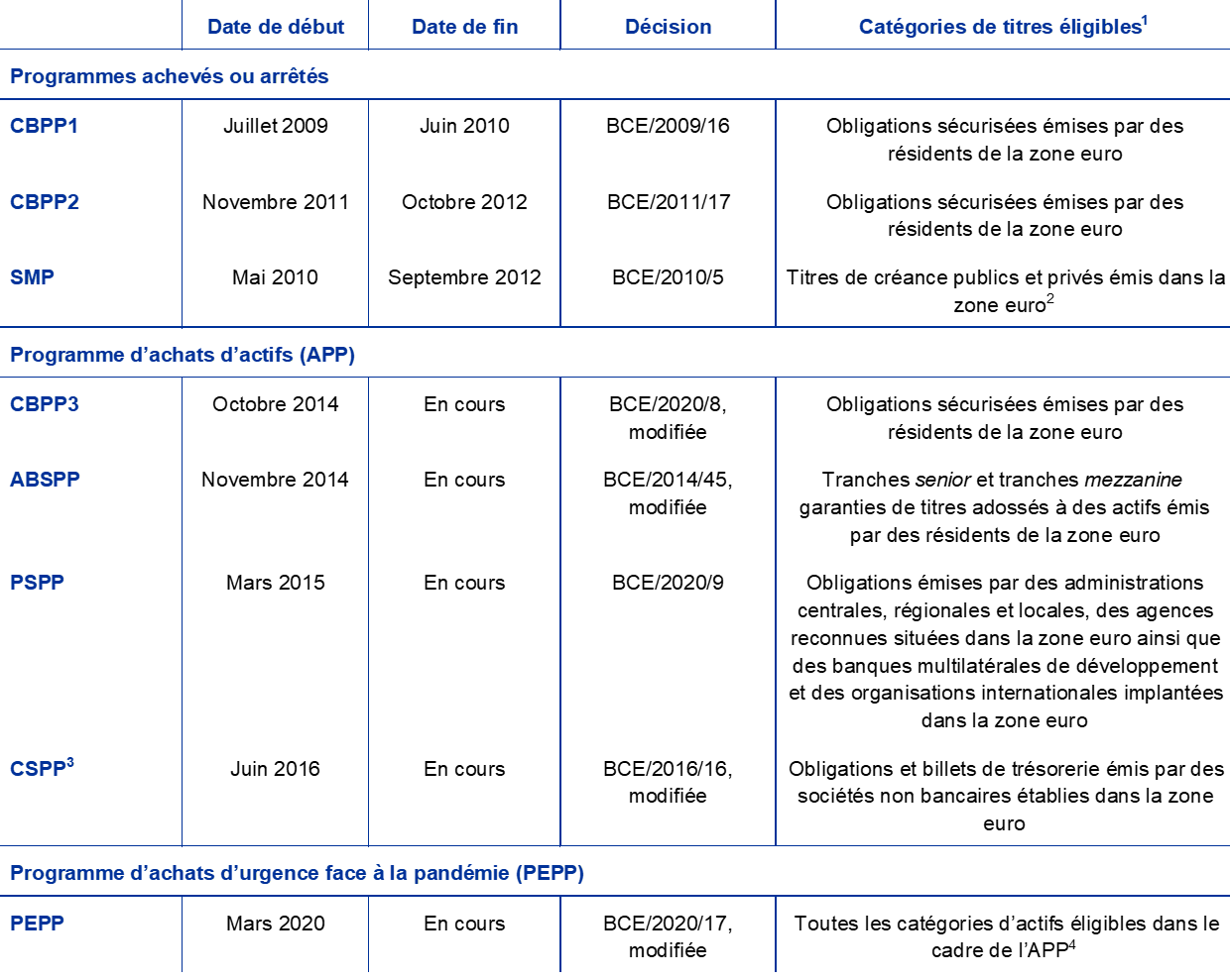 - L’APP comprend le troisième programme d’achats d’obligations sécurisées (CBPP3), le programme d’achats de titres adossés à des actifs (ABSPP), le programme d’achats de titres du secteur public (PSPP) et le programme d’achats de titres du secteur des entreprises (CSPP). La BCE ne procède pas à l’acquisition de titres en vertu du CSPP. Des informations supplémentaires sur l’APP sont disponibles sur le site Internet de la BCE.
