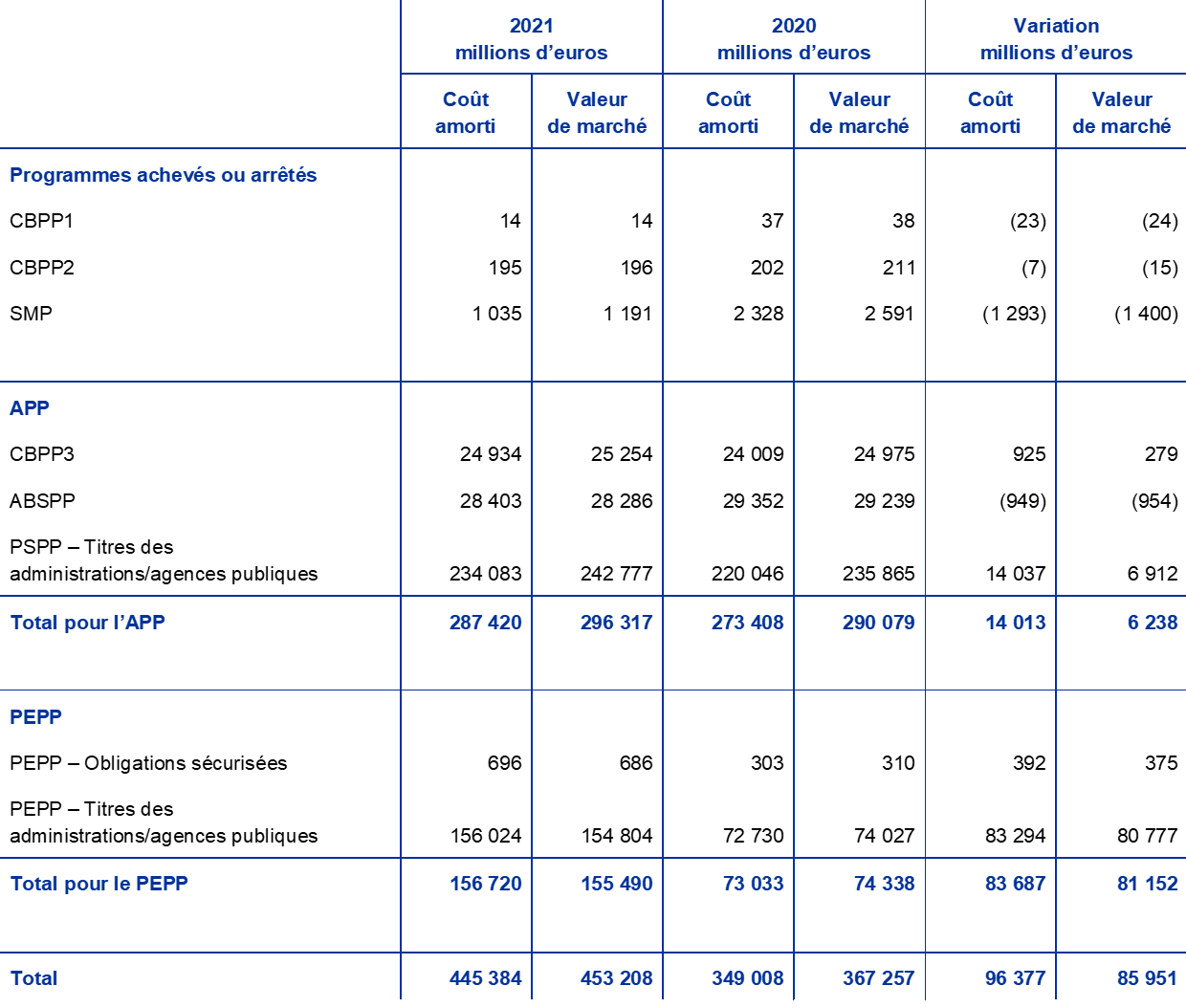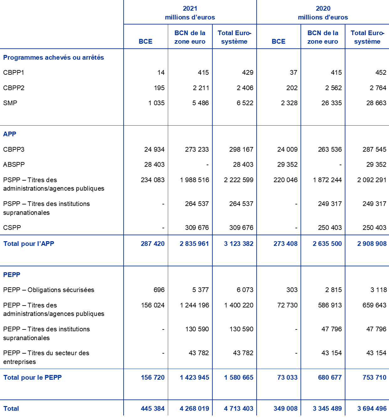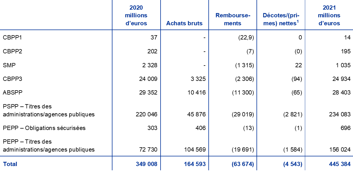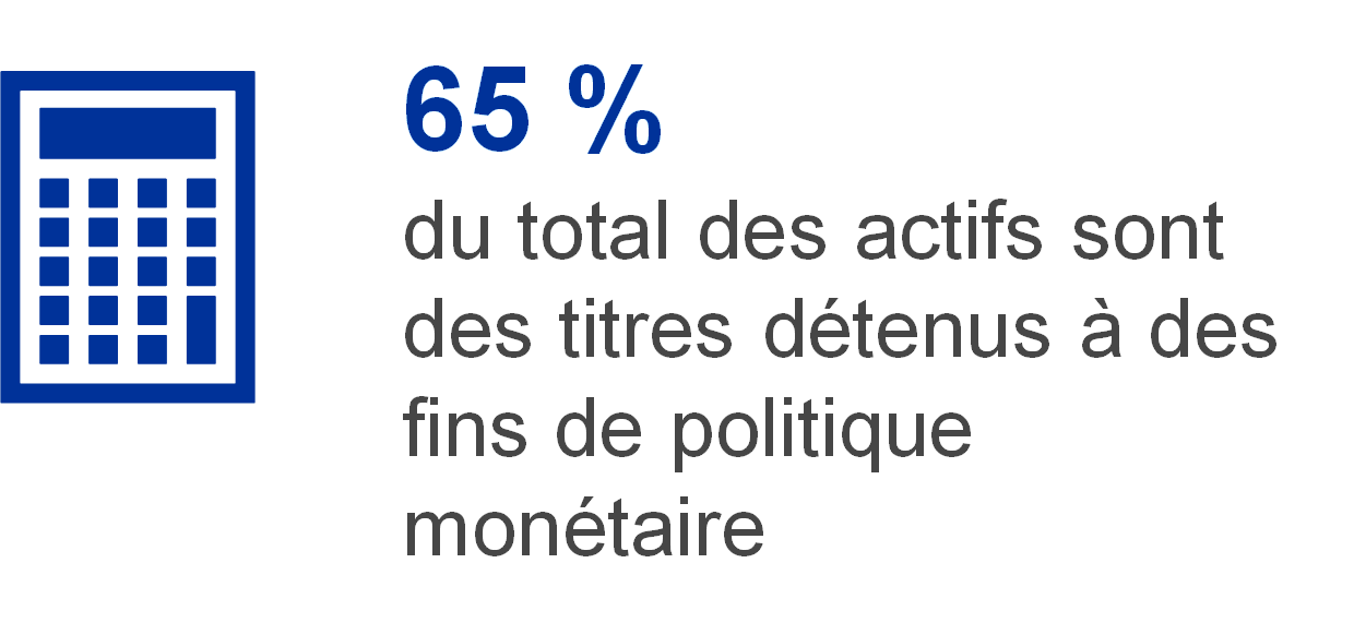 Les titres libellés en euros détenus à des fins de politique monétaire représentaient 65 % du total des actifs de la BCE à la fin de 2021. Cette rubrique du bilan de la BCE comprend les titres acquis en vertu du Programme pour les marchés de titres (Securities Markets Programme, SMP), des trois programmes d’achats d’obligations sécurisées (CBPP1, CBPP2 et CBPP3), de l’ABSPP, du PSPP et du PEPP.