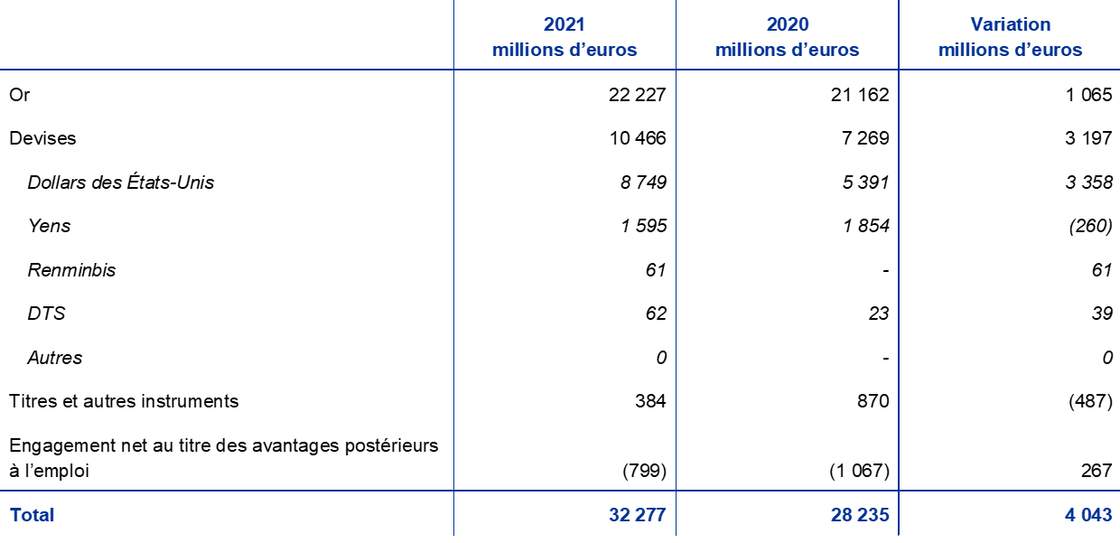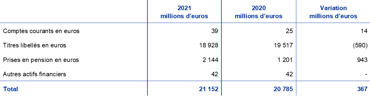 - Avoirs comprenant des actifs inscrits au bilan dans les rubriques « Créances en devises sur des non-résidents de la zone euro – Comptes auprès de banques, titres, prêts et autres actifs en devises » et « Créances en devises sur des résidents de la zone euro ».