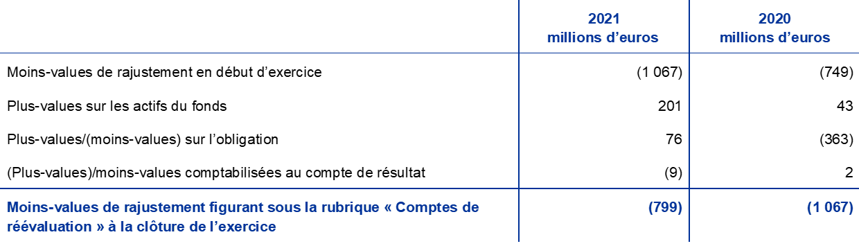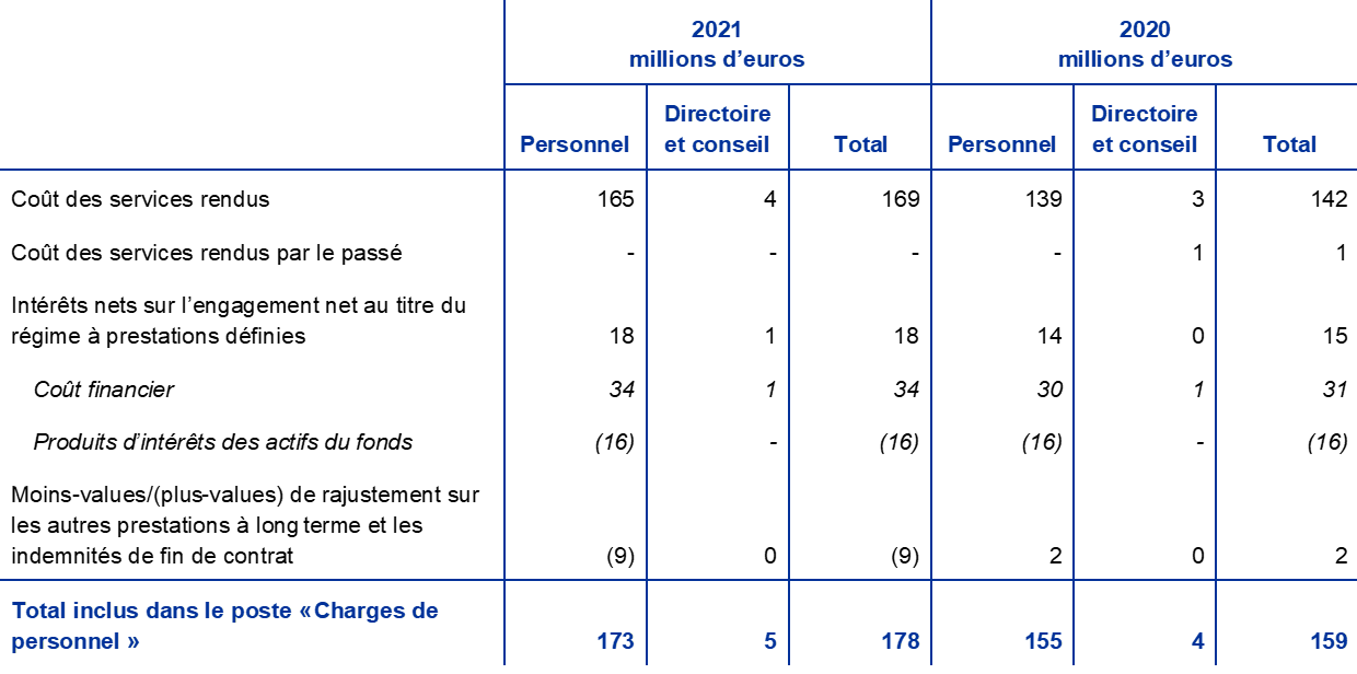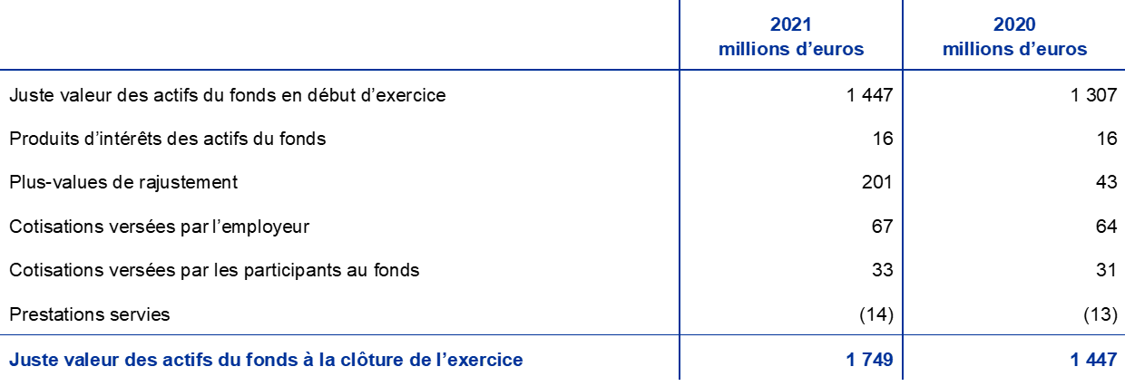 - Le régime à prestations définies n’intègre que les cotisations obligatoires versées par la BCE et les employés. Les versements supplémentaires effectués par les membres du personnel, sur une base volontaire, dans un fonds à cotisations définies se sont élevés en 2021 à 220 millions d’euros (contre 186 millions d’euros en 2020). Ces contributions sont investies dans les actifs du fonds et donnent lieu à une obligation correspondante de valeur égale.
