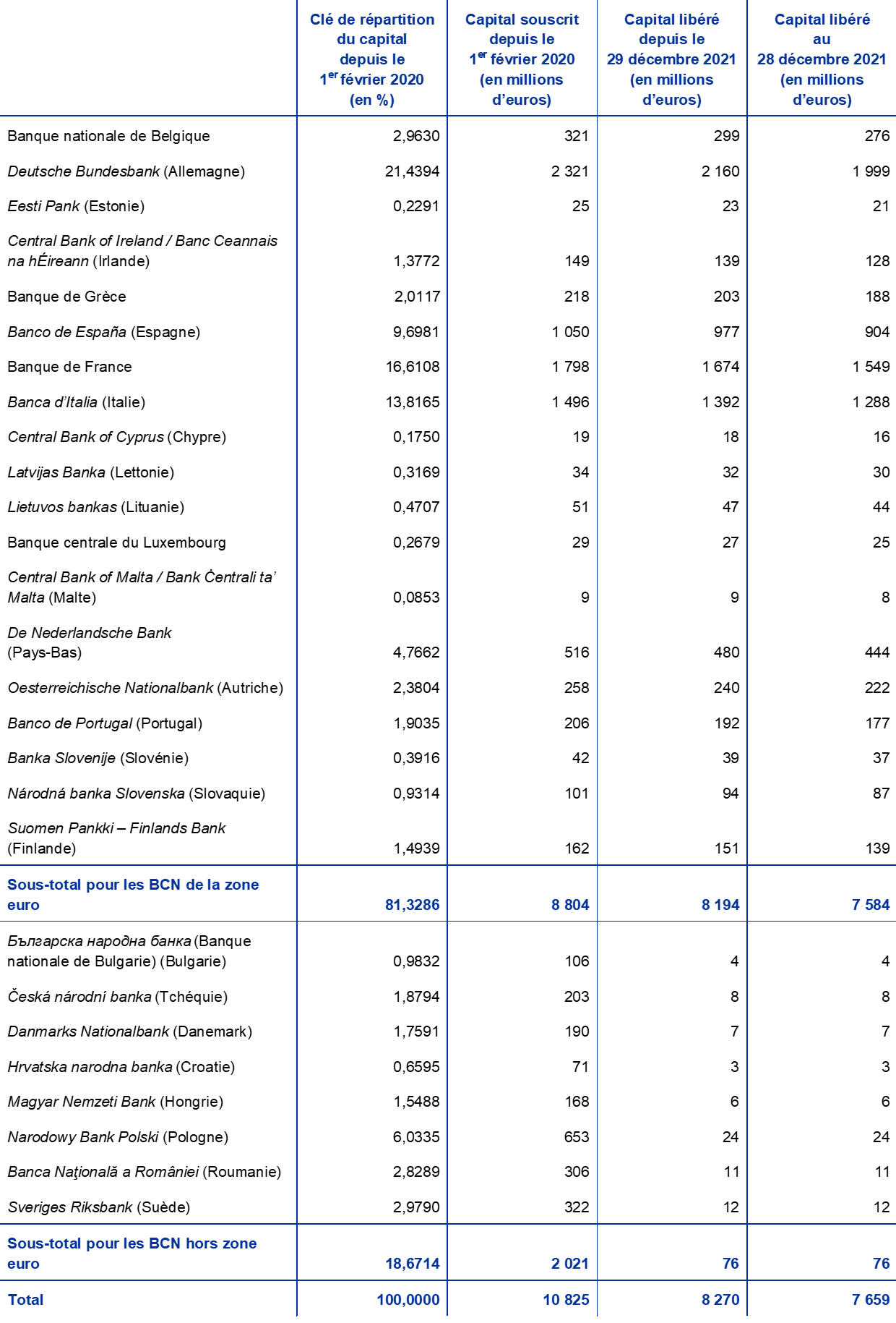 À la suite du retrait de la Banque d’Angleterre du SEBC, en 2020, les parts des autres BCN de la zone euro dans le capital souscrit de la BCE ont augmenté. Le Conseil des gouverneurs a décidé que, en 2020, les BCN restantes ne couvriraient que le capital libéré de 58 millions d’euros de la Banque d’Angleterre après sa sortie et qu’elles libéreraient intégralement leurs souscriptions revues à la hausse en deux versements annuels de même montant, en 2021 et 2022 respectivement. Après le premier versement effectué par les BCN de la zone euro, le capital libéré de la BCE a augmenté de 0,6 milliard d’euros, à 8,3 milliards d’euros, en 2021. Il sera encore accru de 0,6 milliard d’euros, à 8,9 milliards d’euros, en 2022[14].