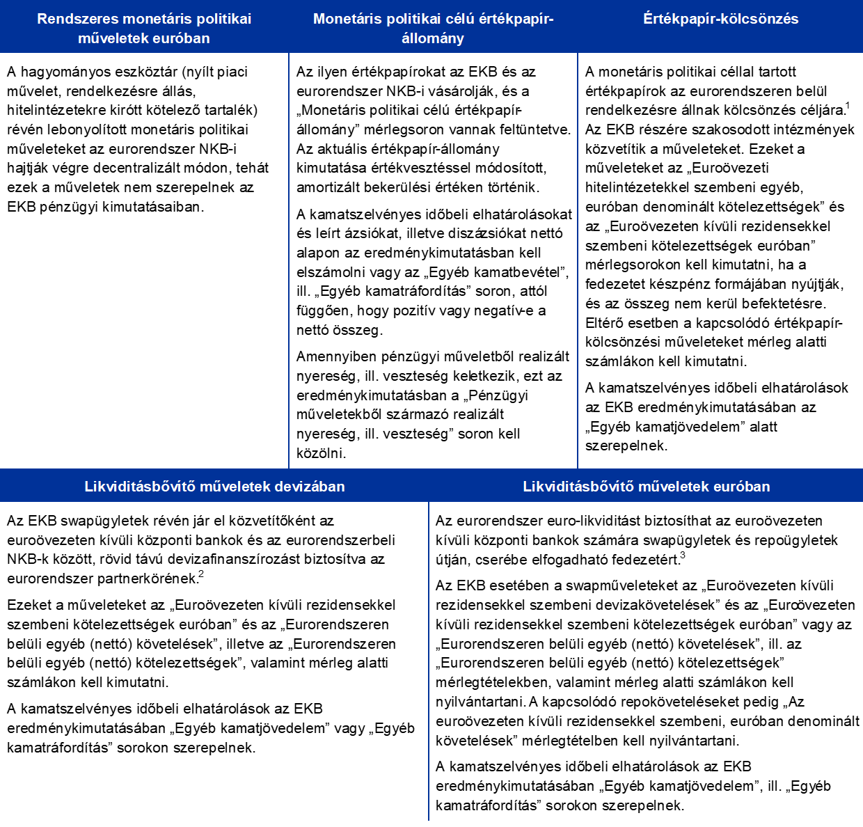Az eurorendszer monetáris politikai műveleteiről az EKB és az NKB-k pénzügyi kimutatásaiban számolunk be, ami tükrözi az alapelvet, hogy az eurorendszer monetáris politikája decentralizált módon valósul meg. Az alábbi, 1. táblázatban az EKB megbízatásának teljesítéséhez szükséges legfontosabb műveleteket és feladatköröket tekintjük át, valamint bemutatjuk ezek hatását pénzügyi kimutatásaira.