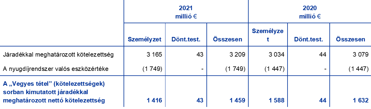 - Az Igazgatóság és a Felügyeleti Testület EKB által alkalmazott mostani tagságának nyugdíjrendszerével kapcsolatban az eredménykimutatásban megjelenített nettó összeget lásd a „Vegyes tétel” című 13.3 pontban.