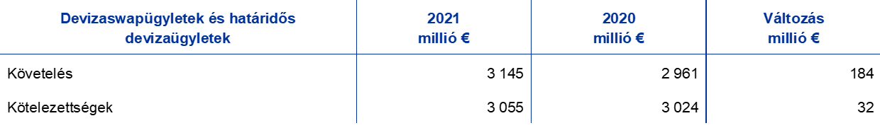 - Amennyiben az év végén van olyan készpénzfedezet, amely nincs befektetve, ezek az ügyletek a mérlegen belüli számlákon kerülnek kimutatásra (lásd az „Euroövezeti hitelintézetekkel szembeni egyéb, euróban denominált kötelezettségek” című 9. pontot, továbbá az „Euroövezeten kívüli rezidensekkel szembeni kötelezettségek euróban” című 11. pontot).
