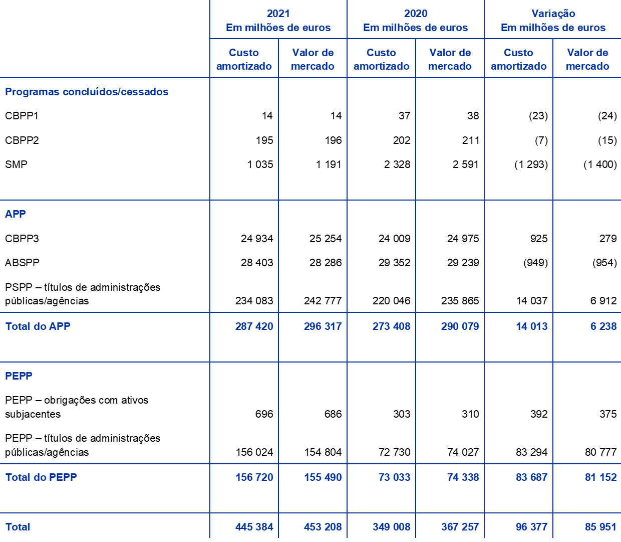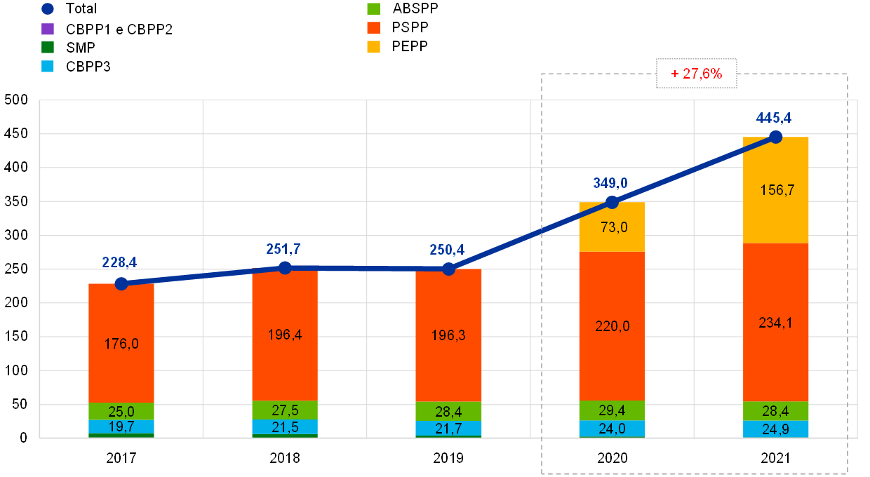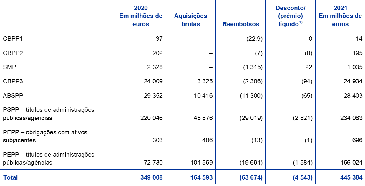 Em 2021, com base nas decisões do Conselho do BCE aplicáveis, o BCE prosseguiu as suas aquisições líquidas de títulos ao abrigo do APP e do PEPP, incluindo o reinvestimento dos montantes dos pagamentos de capital de títulos vincendos adquiridos no âmbito destes programas. Em resultado dessas aquisições, a carteira de títulos detidos pelo BCE para fins de política monetária aumentou 96,4 mil milhões de euros, passando para 445,4 mil milhões de euros (gráfico 2), correspondendo a maior parte deste aumento a compras no contexto do PEPP. A diminuição de 1,3 mil milhões de euros nas posições em ativos detidos ao abrigo do SMP, do CBPP1 e do CBPP2 deveu‑se a reembolsos.