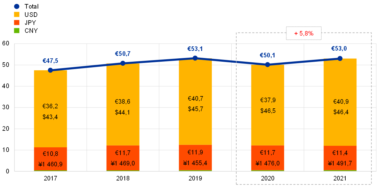 O dólar dos Estados Unidos continuou a ser a principal componente das posições em moeda estrangeira do BCE, correspondendo a aproximadamente 77% do seu total no final de 2021.