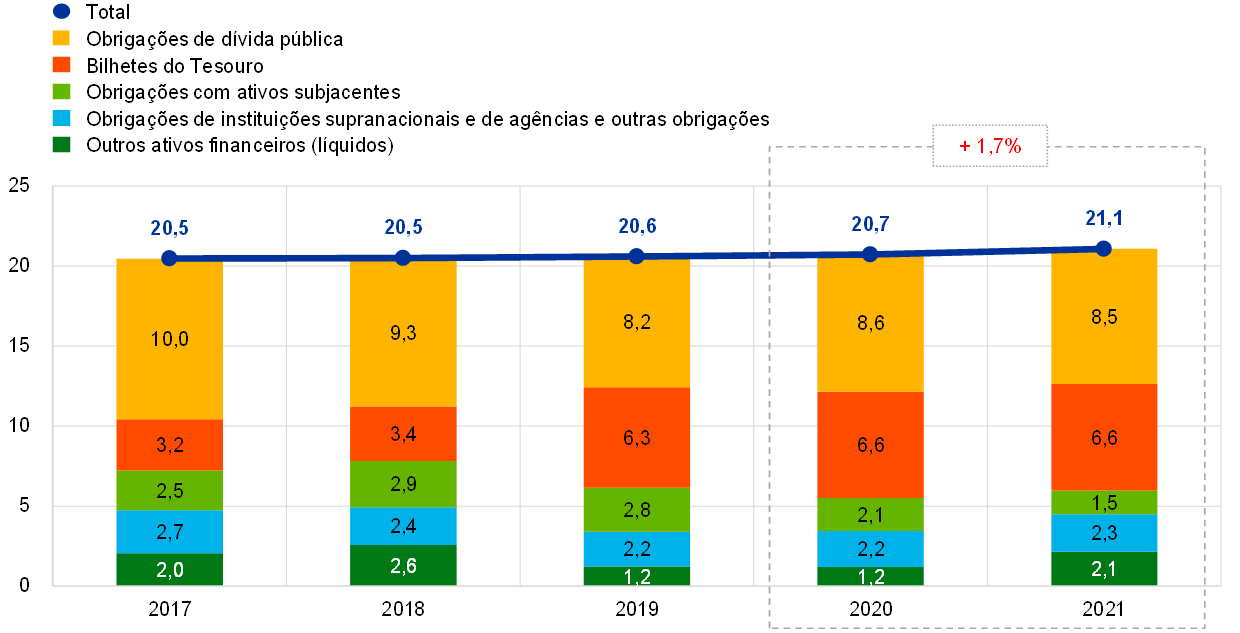 No período de 2017 a 2021, a evolução do balanço do BCE foi impulsionada principalmente pelas aquisições definitivas de títulos pelo BCE como parte da execução da política monetária do Eurosistema (gráfico 1). O balanço do BCE expandiu‑se em 2018, sobretudo devido à aquisição líquida de títulos ao abrigo do programa de compra de ativos (asset purchase programme – APP)[6]. As aquisições líquidas ao abrigo deste programa cessaram em dezembro de 2018 e foram retomadas em novembro de 2019. Em resultado, o crescimento do balanço do BCE foi mais lento em 2019 e deveu‑se maioritariamente a aumentos do valor de mercado dos ativos de reserva do BCE e do valor total das notas de euro em circulação. Em 2020, a fim de dar resposta ao impacto da pandemia de coronavírus (COVID‑19), o Conselho do BCE decidiu adotar um conjunto abrangente de medidas de política monetária, incluindo o lançamento do programa de compra de ativos devido a emergência pandémica (pandemic emergency purchase programme – PEPP)[7], o que resultou num novo crescimento do balanço. As aquisições de ativos ao abrigo do APP e do PEPP prosseguiram em 2021, aumentando ainda mais a dimensão do balanço do BCE.