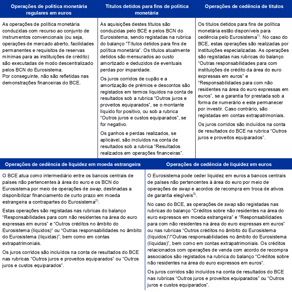 As operações de política monetária do Eurosistema são registadas nas demonstrações financeiras do BCE e dos BCN dos países da área do euro, refletindo o princípio da execução descentralizada da política monetária no Eurosistema. O quadro 1, a seguir, descreve de forma breve as principais operações e funções do BCE na prossecução do seu mandato, assim como o impacto das mesmas nas demonstrações financeiras da instituição.