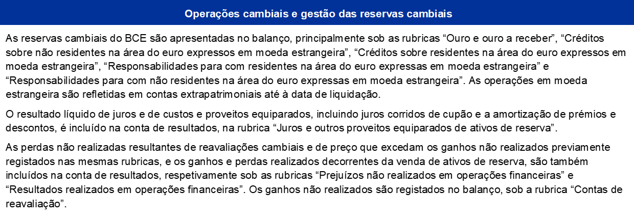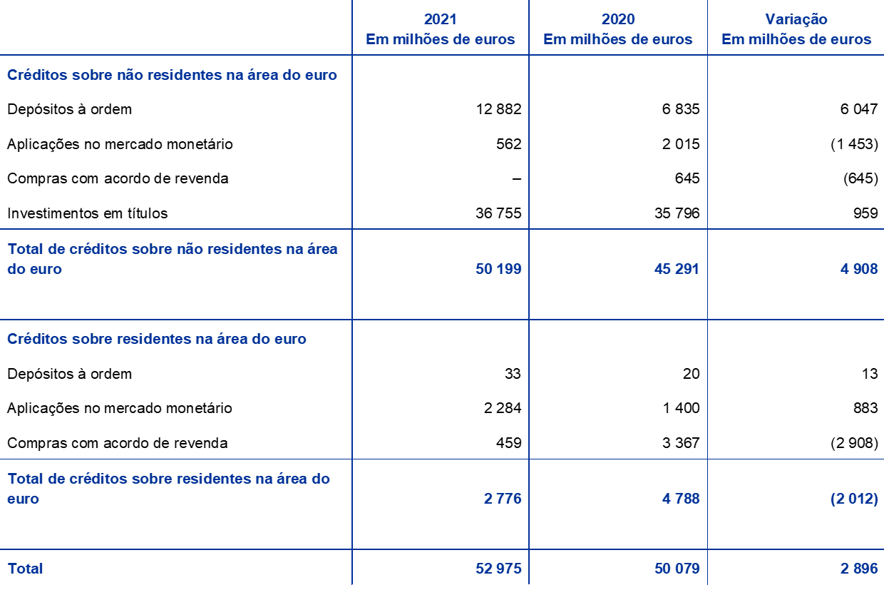 - Estas posições consistem em ativos incluídos nas rubricas do balanço “Créditos sobre não residentes na área do euro expressos em moeda estrangeira – Depósitos e investimentos em títulos, empréstimos ao exterior e outros ativos externos” e “Créditos sobre residentes na área do euro expressos em moeda estrangeira”.