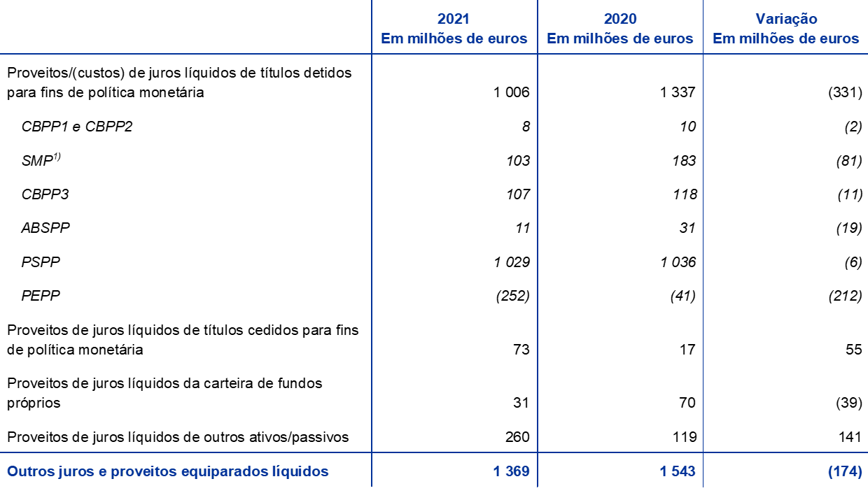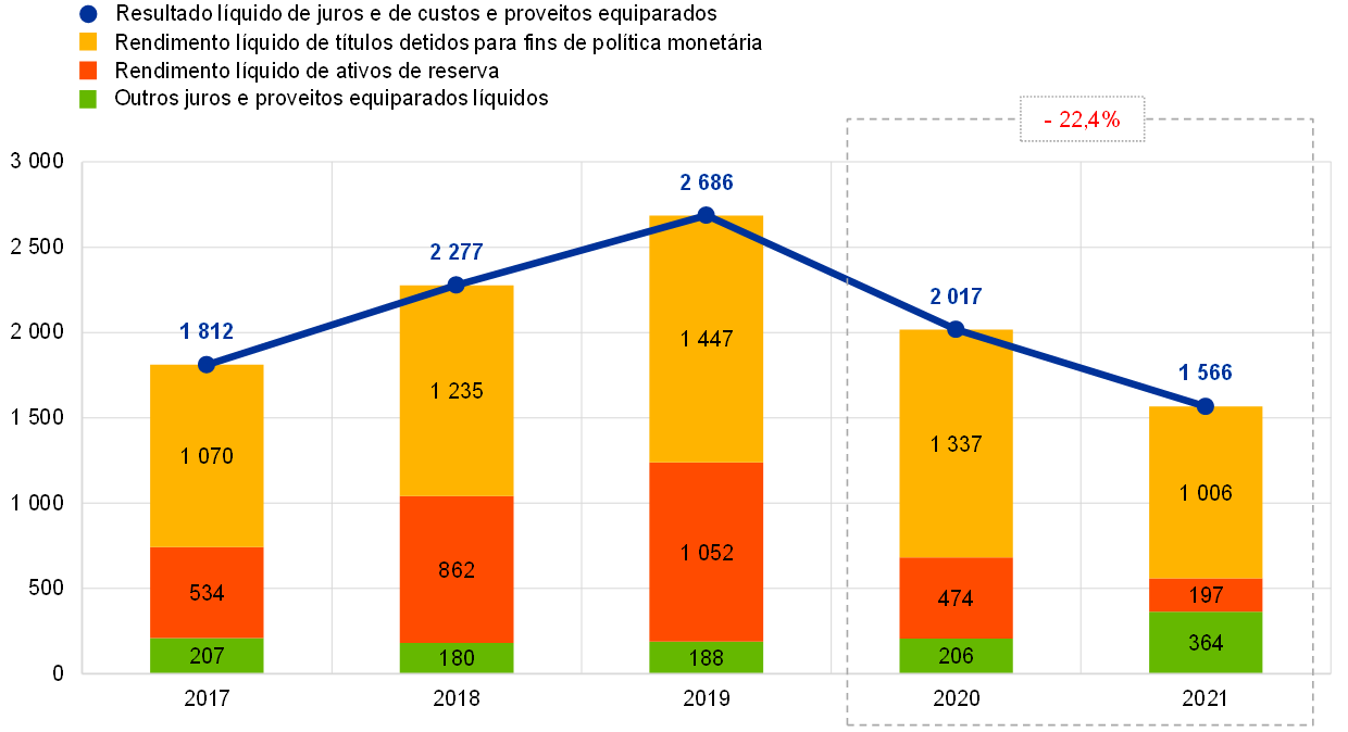 Em 2021, os títulos detidos para fins de política monetária geraram 64% do resultado líquido de juros e de custos e proveitos equiparados do BCE.