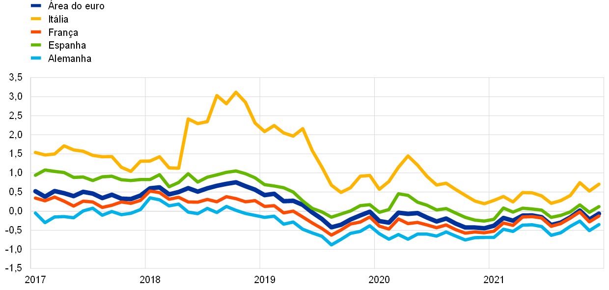 Em dezembro de 2021, o Conselho do BCE anunciou[8] que aumentaria o ritmo mensal de aquisições líquidas no âmbito do APP para 40 mil milhões de euros no segundo trimestre e que este passaria a ser de 30 mil milhões de euros no terceiro trimestre de 2022. A partir de outubro de 2022, as aquisições líquidas de ativos serão mantidas a um ritmo mensal de 20 mil milhões de euros enquanto for necessário, com vista a reforçar o impacto acomodatício das taxas de juro diretoras do BCE, devendo cessar pouco antes de o Conselho do BCE as começar a aumentar. O Conselho do BCE decidiu igualmente descontinuar as aquisições líquidas de ativos no quadro do PEPP no final de março de 2022, podendo estas ser retomadas, se necessário, para contrariar choques negativos relacionados com a pandemia. O Eurosistema continuará a reinvestir, na totalidade, os pagamentos de capital dos títulos vincendos adquiridos no âmbito do APP e do PEPP, em consonância com a decisão do Conselho do BCE.
