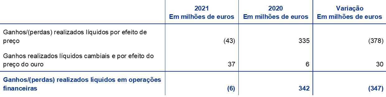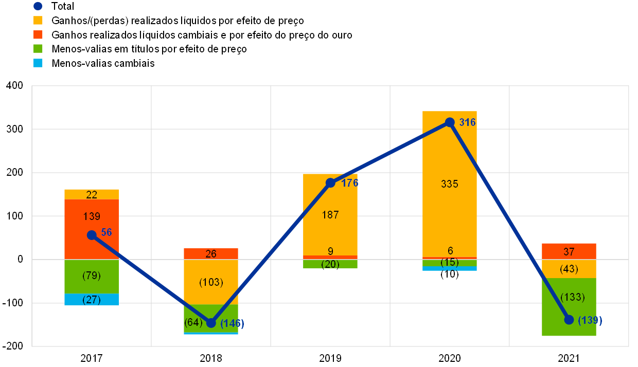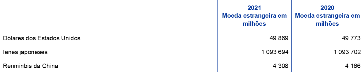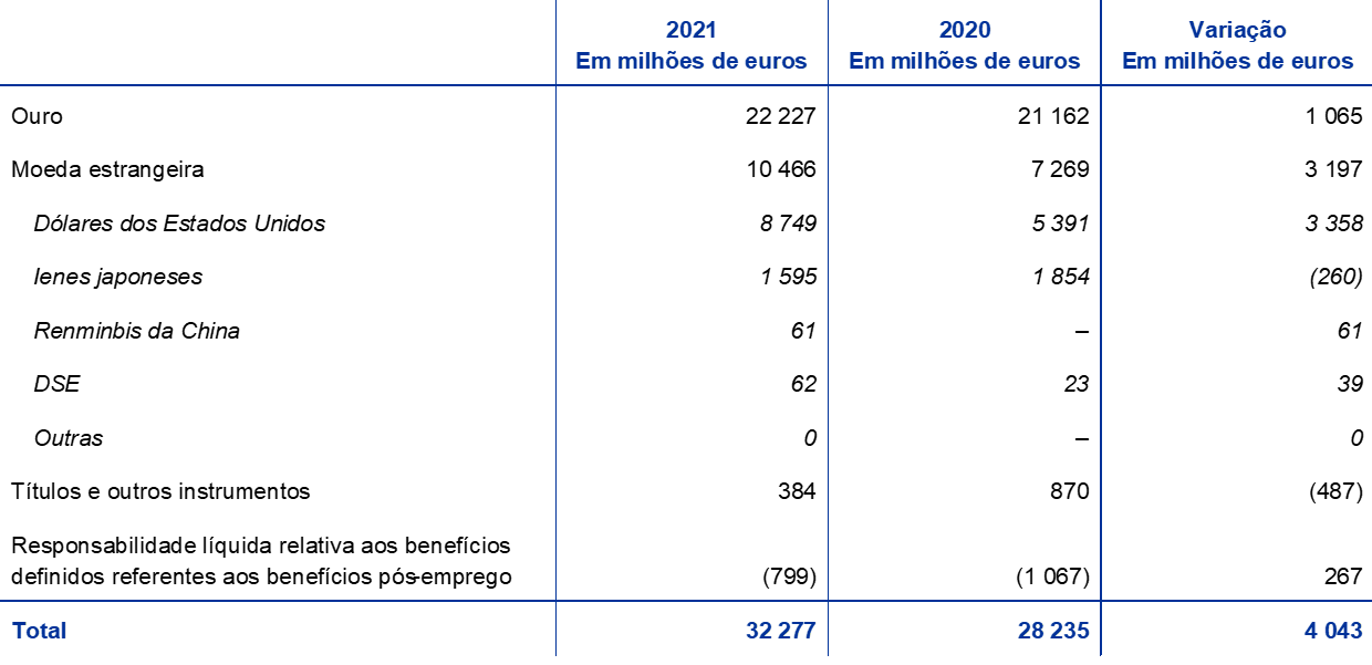 Em 2021, o valor total em euros dos ativos de reserva do BCE – que consistem em ouro, direitos de saque especiais (DSE), dólares dos Estados Unidos (USD), ienes do Japão (JPY) e renminbis da China (CNY) – aumentou 4,5 mil milhões de euros, passando para 80,3 mil milhões de euros.