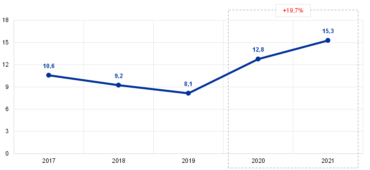 No final de 2021, o valor total das notas de euro em circulação ascendia a 1 544,4 mil milhões de euros, o que corresponde a um aumento de 8% em comparação com o final de 2020. Ao BCE foi atribuída uma participação de 8% no valor total de notas de euro em circulação, a qual correspondia a 123,6 mil milhões de euros no final do ano. Dado que o BCE não emite notas de euro, detém créditos intra‑Eurosistema sobre os BCN dos países da área do euro num montante correspondente ao valor das notas de euro em circulação.