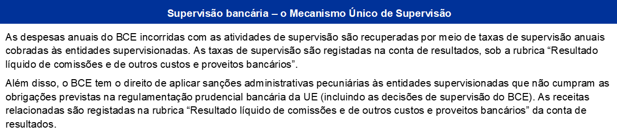 - As despesas incorridas pelo BCE no desempenho das suas atividades de supervisão são recuperadas por meio das taxas de supervisão anuais cobradas às entidades supervisionadas. Para mais pormenores, consultar o sítio do BCE dedicado à supervisão bancária.