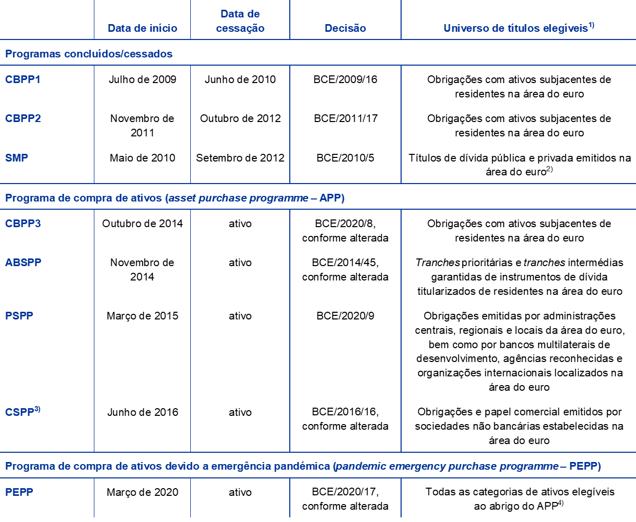 - O APP consiste no terceiro programa de compra de obrigações com ativos subjacentes (third covered bond purchase programme – CBPP3), no programa de compra de instrumentos de dívida titularizados (asset-backed securities purchase programme – ABSPP), no programa de compra de ativos do setor público (public sector purchase programme – PSPP) e no programa de compra de ativos do setor empresarial (corporate sector purchase programme – CSPP). O BCE não adquire títulos ao abrigo do CSPP. São disponibilizados mais pormenores sobre o APP no sítio do BCE.