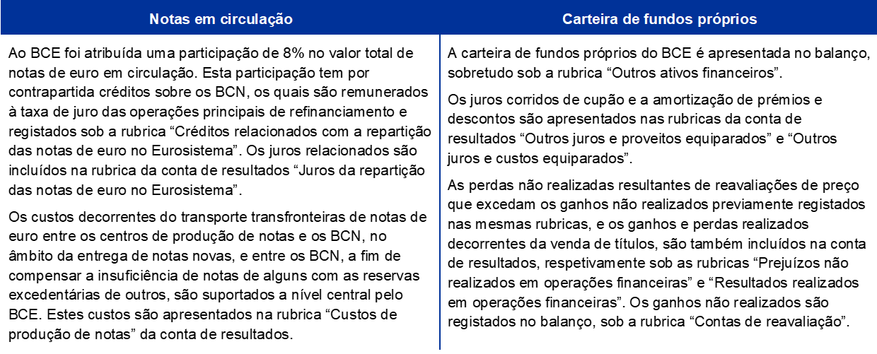- Quando montantes em numerário depositados a título de garantia de operações de cedência de títulos permanecem por investir no final do exercício, as operações associadas são registadas em contas do balanço (ver a nota 9, “Outras responsabilidades para com instituições de crédito da área do euro expressas em euros”, e a nota 11, “Responsabilidades para com não residentes na área do euro expressas em euros”).