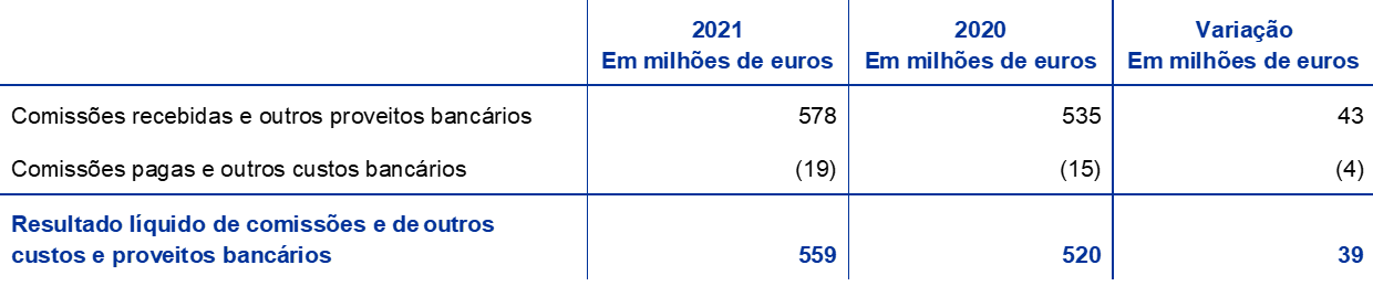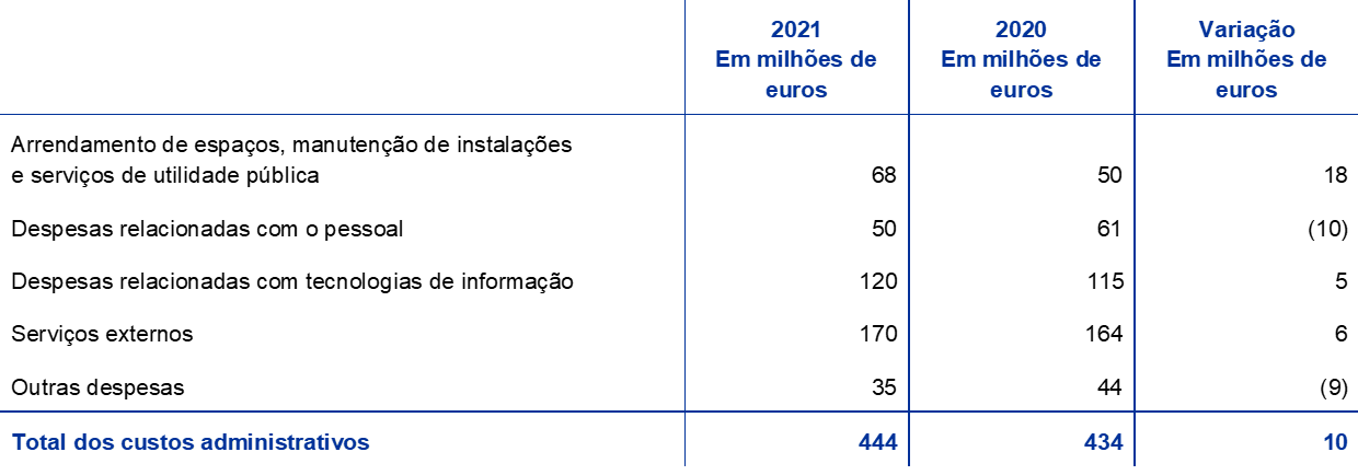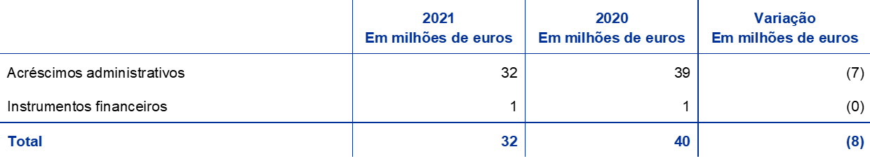 Em 2021, esta rubrica incluía o reembolso de sanções administrativas aplicadas anteriormente pelo BCE a três entidades supervisionadas do mesmo grupo, cujas decisões relevantes foram parcialmente anuladas pelo tribunal (ver a nota 25, “Resultado líquido de comissões e de outros custos e proveitos bancários”).