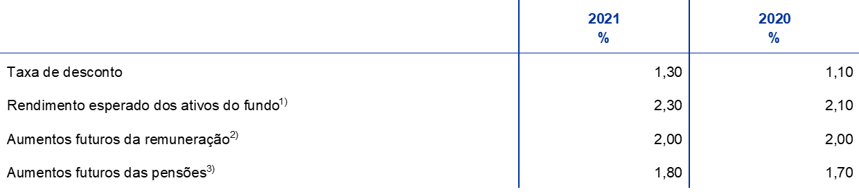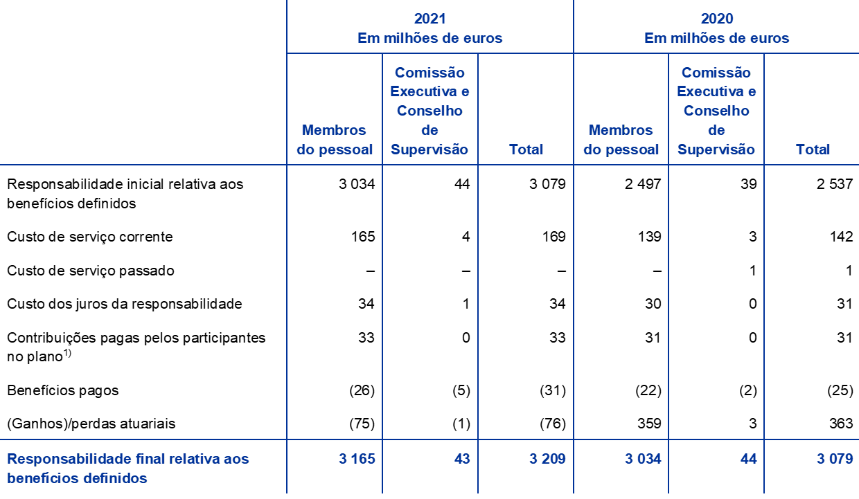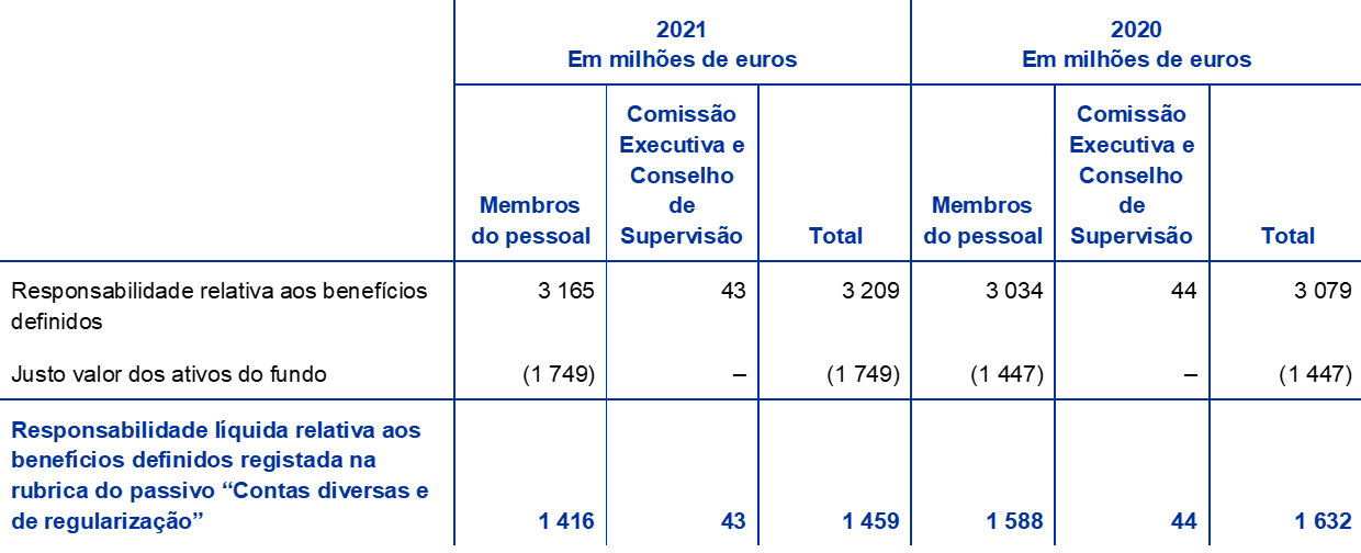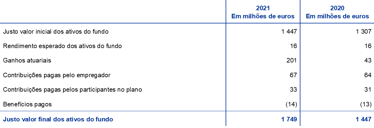 - O pilar de benefícios definidos do plano reflete apenas as contribuições obrigatórias do BCE e dos membros do pessoal. As contribuições voluntárias dos membros do pessoal num pilar de contribuições definidas em 2021 cifraram-se em 220 milhões de euros (186 milhões de euros, em 2020). Essas contribuições são investidas nos ativos do fundo e originam uma responsabilidade correspondente de valor igual.