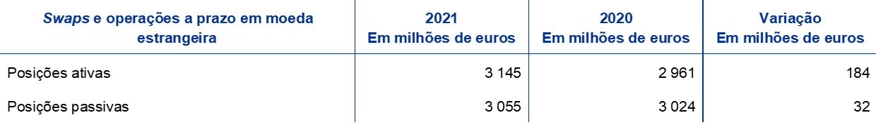- Estas posições consistem nos ativos menos os passivos denominados na moeda estrangeira correspondente, os quais estão sujeitos a reavaliação cambial. São incluídas nas rubricas do ativo, “Créditos sobre não residentes na área do euro expressos em moeda estrangeira”, “Créditos sobre residentes na área do euro expressos em moeda estrangeira” e “Acréscimos e diferimentos”, e nas rubricas do passivo, “Diferenças de reavaliação de instrumentos extrapatrimoniais” e “Acréscimos e diferimentos” e têm em conta os swaps e operações a prazo em moeda estrangeira registados em rubricas extrapatrimoniais. Não incluem ganhos resultantes de reavaliações do preço de instrumentos financeiros denominados em moeda estrangeira.
