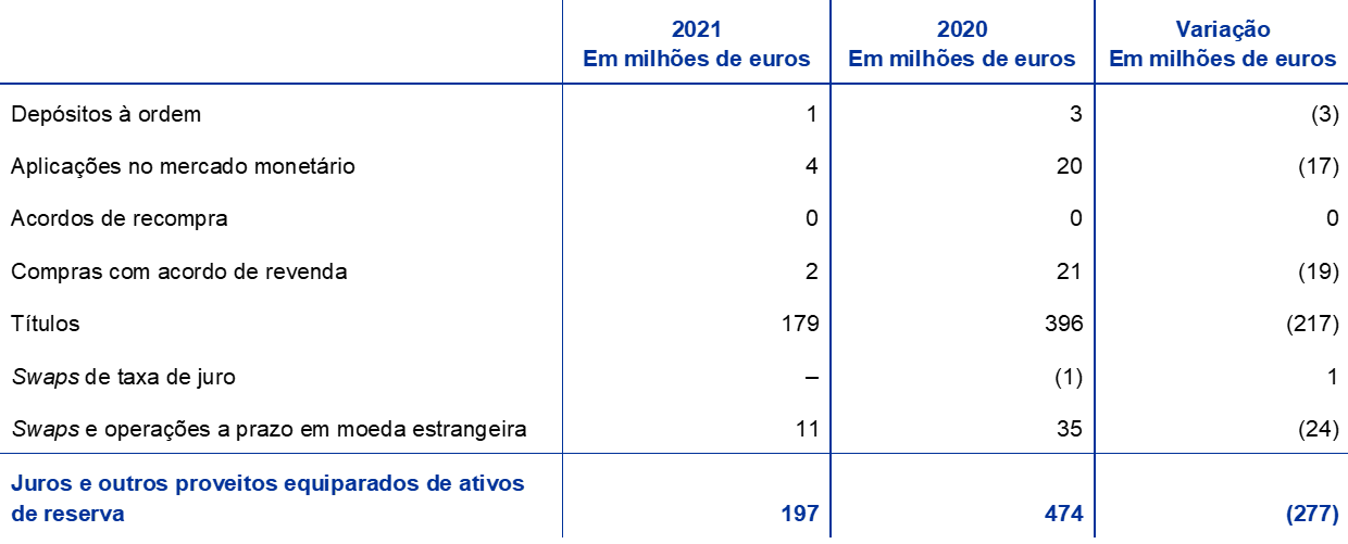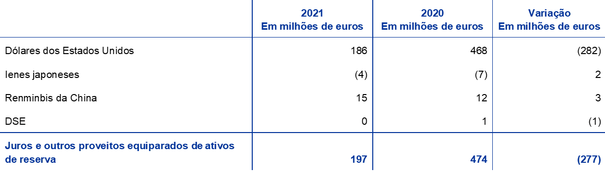 O rendimento líquido dos ativos de reserva diminuiu 277 milhões de euros, passando para 197 milhões de euros, principalmente em resultado dos menores juros e outros proveitos equiparados auferidos em títulos denominados em dólares dos Estados Unidos. Devido às baixas taxas de rendibilidade das obrigações denominadas em dólares dos Estados Unidos ao longo da maior parte de 2020 e 2021 (gráfico 17), bem como às vendas e aos reembolsos de obrigações de maior rendibilidade adquiridas no passado, a taxa de rendibilidade média da carteira do BCE de ativos denominados em dólares dos Estados Unidos registou nova descida em 2021 em comparação com o ano anterior.