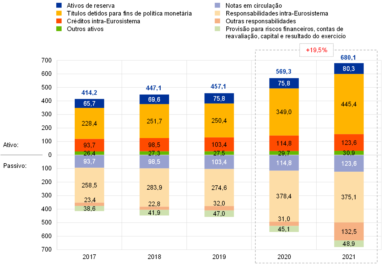 Em 2021, o balanço do BCE aumentou 110,8 mil milhões de euros, passando para 680,1 mil milhões de euros, devido sobretudo à quota do BCE nas aquisições de títulos ao abrigo do PEPP e do APP. Essas aquisições resultaram num aumento dos títulos detidos para fins de política monetária, tendo a liquidação em numerário das mesmas, através de contas no TARGET2, levado a um aumento correspondente das responsabilidades intra‑Eurosistema. O aumento das responsabilidades intra‑Eurosistema foi mais do que compensado pelo numerário recebido no TARGET2 de clientes do BCE de fora da área do euro, o que também resultou numa subida das outras responsabilidades.