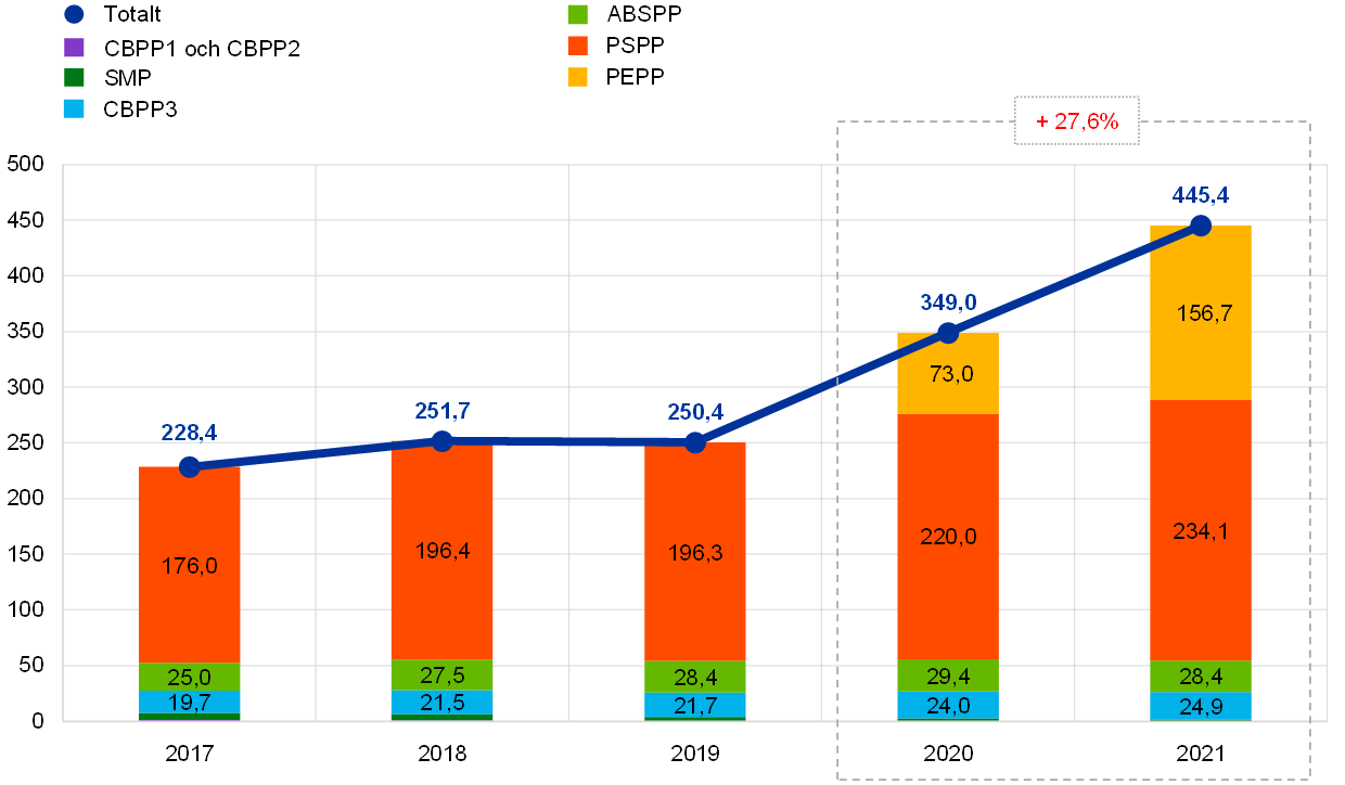I linje med ECB-rådets beslut fortsatte ECB under 2021 med sina nettoköp av värdepapper inom ramen för APP och PEPP, vilket inbegriper återinvestering av förfall av värdepapper som har förvärvats inom dessa program. Som resultat av dessa köp ökade ECB:s värdepappersportfölj för penningpolitiska syften med 96,4 miljarder euro, till 445,4 miljarder euro (se diagram 2). Köp inom PEPP-programmet stod för merparten av denna ökning. Innehavsminskningarna i SMP- CBPP1-, och CBPP2-programmen uppgick till 1,3 miljarder euro och berodde på värdepappersförfall.