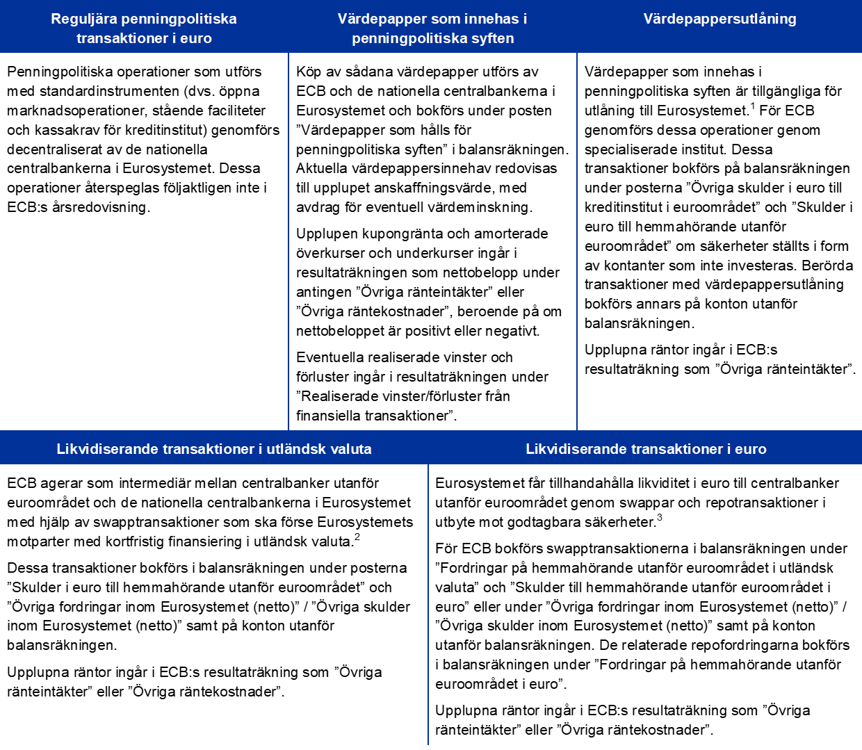 Eurosystemets penningpolitiska transaktioner redovisas i ECB:s och de nationella centralbankernas årsredovisningar, vilket återspeglar principen om decentralisering av penningpolitikens genomförande i Eurosystemet. Tabell 1 nedan ger en översikt över ECB:s viktigaste transaktioner och funktioner för att uppfylla sitt mandat och visar hur dessa påverkar ECB:s årsredovisning.