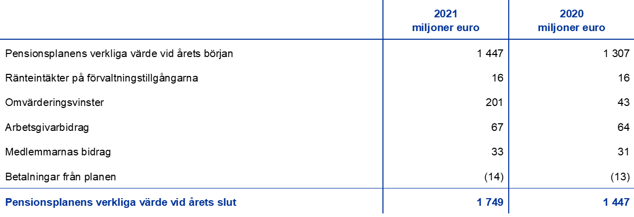 - Den angivna förmånspelaren i planen återspeglar endast det obligatoriska bidraget från ECB och personalen. Frivilliga inbetalningar av personalen till ett avgränsat pensionsbidragssystem uppgick 2021 till 220 miljoner euro (2020: 186 miljoner euro). Dessa bidrag investeras i fondtillgångarna och leder till ett motsvarande åtagande av samma värde.