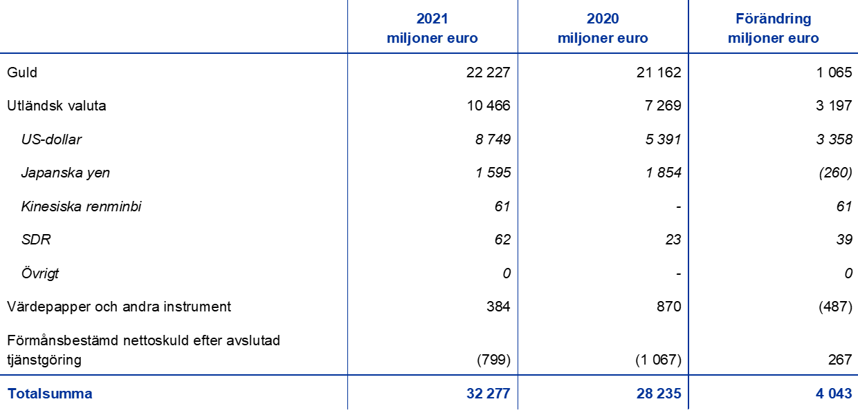 Under 2021 ökade det totala värdet i euro på ECB:s valutareservportfölj, som består av guld, särskilda dragningsrätter, US-dollar, japanska yen och kinesiska renminbin, med 4,5 miljarder euro till 80,3 miljarder euro.