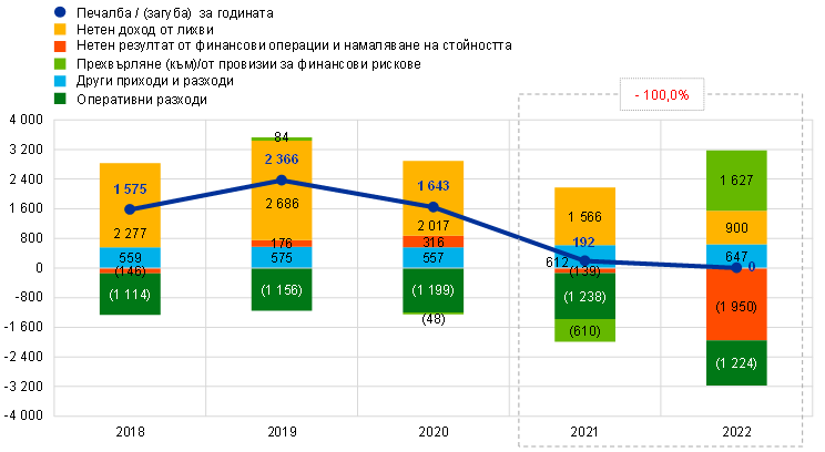 След освобождаването на 1627 млн. евро от провизиите за финансови рискове, за да бъдат компенсирани понесените през 2022 г. загуби, финансовият резултат на ЕЦБ е нула (спрямо 192 млн. евро през 2021 г.). Загубите възникнаха главно от i) разходите за лихви в резултат на нетното задължение на ЕЦБ в TARGET2 и ii) отрицателния нетен резултат от финансови операции и обезценки (Графика 13).