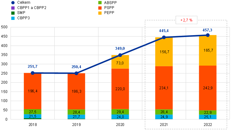 ECB na základě příslušných rozhodnutí Rady guvernérů pokračovala do konce března 2022 v čistých nákupech cenných papírů v rámci PEPP, zatímco čisté nákupy v rámci APP skončily k 1. červenci 2022. Zároveň byly splátky jistiny splatných cenných papírů držených v obou portfoliích v průběhu roku nadále plně reinvestovány. V důsledku těchto nákupů a reinvestic vzrostlo portfolio cenných papírů pro účely měnové politiky v držení ECB o 11,9 mld. EUR na 457,3 mld. EUR (graf 2), přičemž objem PEPP vzrostl o 9,0 mld. EUR a objem PSPP o 8,8 mld. EUR. Pokles objemu aktiv držených v rámci programu ABSPP o 5,5 mld. EUR byl způsoben splacením jejich části.