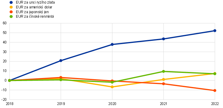 Eurová hodnota zlata a pohledávek ve zlatě v držení ECB se v roce 2022 zvýšila o 1,6 mld. EUR na 27,7 mld. EUR (graf 4) v důsledku nárůstu tržní ceny zlata v přepočtu na eura, zatímco objem těchto držených aktiv v ryzích uncích zůstal beze změny. Toto zvýšení také vedlo k odpovídajícímu nárůstu účtů přecenění ECB – zlato (viz část 1.3.2 „finanční zdroje“).