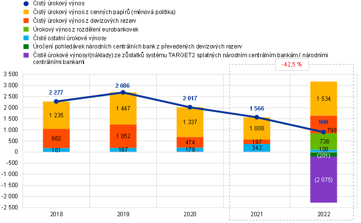 Čistý úrokový výnos ECB poklesl o 666 mil. EUR na 900 mil. EUR (graf 14) především v důsledku úrokového nákladu vyplývajícího z čistého závazku ECB v systému TARGET2. K tomuto poklesu přispěly také úrokové náklady související s úročením pohledávek národních centrálních bank zemí eurozóny z devizových rezerv převedených na ECB. Tyto náklady byly částečně vyrovnány vyššími úrokovými výnosy z i) pohledávek ECB z rozdělení eurobankovek v rámci Eurosystému, ii) devizových rezerv a iii) cenných papírů držených pro účely měnové politiky.