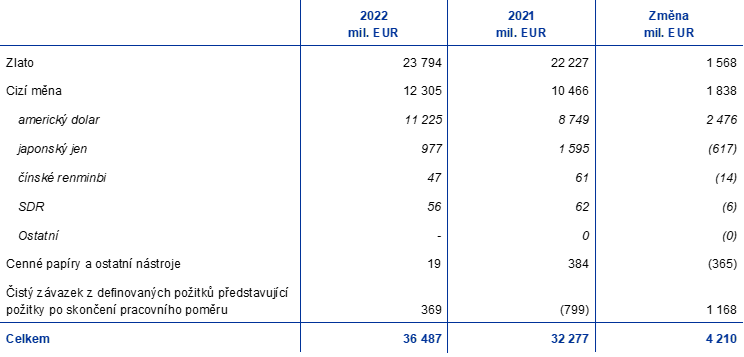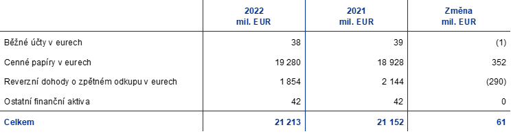 V roce 2022 se celková eurová hodnota devizových rezerv ECB, sestávajících ze zlata, zvláštních práv čerpání, amerických dolarů, japonských jenů a čínských renminbi, zvýšila o 4,1 mld. EUR na 84,5 mld. EUR.