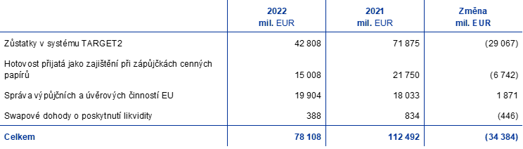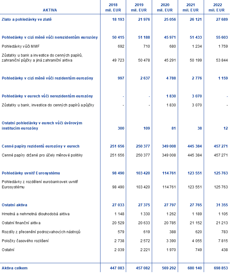 V roce 2022 došlo k nárůstu objemu rozvahy ECB o 18,7 mld. EUR na 698,9 mld. EUR, zejména vlivem podílu ECB na nákupech cenných papírů v rámci PEPP a APP. Tyto nákupy vedly k růstu v položce „cenné papíry držené pro účely měnové politiky“ a současně hotovostní vypořádání těchto nákupů prostřednictvím účtů TARGET2 vedlo k odpovídajícímu nárůstu v položce „závazky uvnitř Eurosystému“. Nad tímto nárůstem závazků uvnitř Eurosystému převážil příliv hotovosti v důsledku vyšších vkladů rezidentů eurozóny u ECB, což současně vedlo ke zvýšení ostatních závazků.