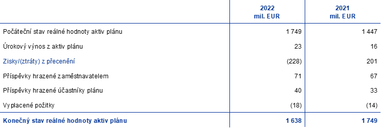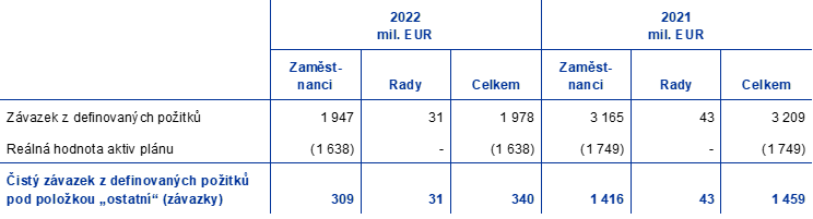 Pilíř definovaných požitků v plánu odráží pouze povinné příspěvky ECB a jejích zaměstnanců. V roce 2022 činily dobrovolné příspěvky zaměstnanců v rámci pilíře definovaných příspěvků 189 mil. EUR (220 mil. EUR v roce 2021). Tyto příspěvky jsou investovány do aktiv plánu a dávají vzniknout odpovídající povinnosti stejné výše.