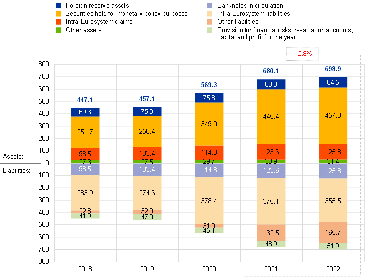 In 2022 the ECB’s Balance Sheet increased by €18.7 billion to €698.9 billion, mainly owing to the ECB’s share of securities purchases under the PEPP and the APP. These purchases resulted in an increase in securities held for monetary policy purposes, while the cash settlement of these purchases via TARGET2 accounts led to a corresponding rise in intra-Eurosystem liabilities. This rise in intra-Eurosystem liabilities was more than offset by cash inflows as a result of higher deposits placed with the ECB by euro area residents, which simultaneously resulted in an increase in other liabilities.