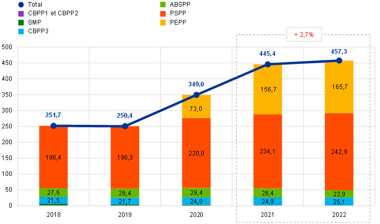 Sur la base des décisions correspondantes du Conseil des gouverneurs, la BCE a poursuivi ses achats nets de titres dans le cadre du PEPP jusque fin mars 2022, tandis que les achats nets dans le cadre de l’APP se sont achevés le 1er juillet 2022. Dans le même temps, les remboursements au titre du principal des titres arrivant à échéance détenus dans les deux portefeuilles ont continué à être entièrement réinvestis au cours de l’année. Par conséquent, le portefeuille de titres détenus par la BCE à des fins de politique monétaire s’est accru de 11,9 milliards d’euros, à 457,3 milliards d’euros (cf. graphique 2), les achats effectués dans le cadre du PEPP et du PSPP augmentant de 9,0 milliards d’euros et de 8,8 milliards d’euros respectivement. La baisse de 5,5 milliards d’euros des titres détenus dans le cadre de l’ABSPP s’explique par des remboursements.