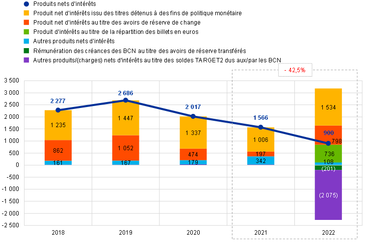 Les produits nets d’intérêts de la BCE ont diminué de 666 millions d’euros, pour atteindre 900 millions d’euros (cf. graphique 14), du fait essentiellement des charges d’intérêts liées aux engagements TARGET2 nets. Les charges d’intérêts liées à la rémunération versée aux BCN de la zone euro au titre de leurs créances relatives aux avoirs de réserve de change transférés à la BCE ont également contribué à cette baisse. Ces charges ont été partiellement compensées par une hausse du produit d’intérêts sur a) les créances de la BCE relatives à la répartition des billets en euros dans l’Eurosystème ; b) les avoirs de réserve de change et c) les titres détenus à des fins de politique monétaire.