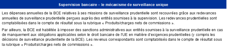 Les dépenses engagées par la BCE pour l’accomplissement de ses missions de surveillance prudentielle sont recouvrées grâce aux redevances annuelles perçues auprès des entités soumises à la supervision. De plus amples informations sont disponibles sur le site internet de la BCE consacré à la supervision bancaire.