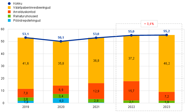 Aastatel 2019–2022 suurenes EKP bilansimaht märkimisväärselt. See oli peamiselt tingitud EKP poolt tehtud väärtpaberite otseostudest eurosüsteemi rahapoliitika rakendamise kontekstis (vt joonis 1). Bilansimahu märkimisväärset kasvu 2020. ja 2021. aastal soodustasid eelkõige varaostukava (APP)[6] raames tehtud väärtpaberite netoostud ja pandeemia majandusmõjude ohjeldamise erakorralise varaostukava (PEPP)[7] käivitamine 2020. aasta märtsis. Väärtpaberite netoostud PEPPi ja APP raames lõpetati vastavalt 2022. aasta märtsi lõpus ja 1. juulil 2022, mistõttu EKP bilansimaht suurenes 2022. aastal mõõdukamalt.
