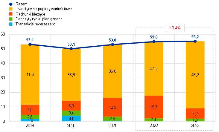 W 2023 suma bilansowa EBC obniżyła się o 24,4 mld EUR, do 674,5 mld EUR. Głównym powodem było stopniowe zmniejszanie się portfela APP wynikające z tego, że od marca do czerwca 2023 reinwestycja spłat kapitału z tytułu zapadających papierów wartościowych z tego portfela była jedynie częściowa, a od lipca 2023 całkowicie jej zaprzestano.