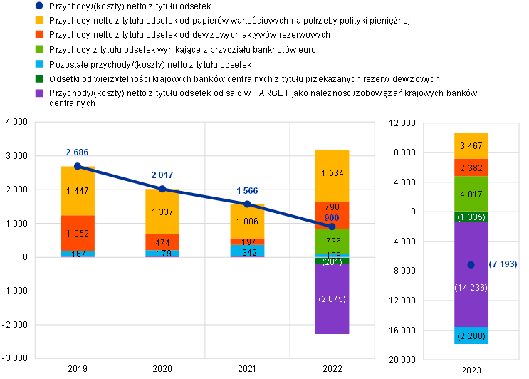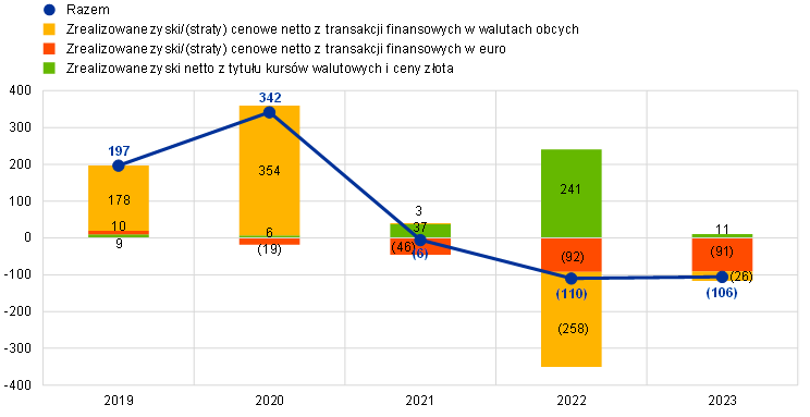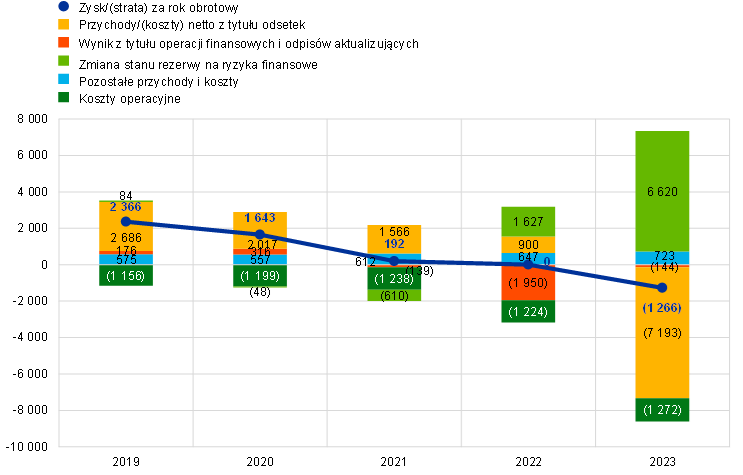 Strata EBC za 2023, po uwolnieniu całości środków z rezerwy na ryzyka finansowe, wyniosła 1266 mln EUR (2022: zero). Na podstawie decyzji Rady Prezesów strata zostanie przeniesiona w bilansie EBC na kolejne okresy i skompensowana przyszłymi zyskami.