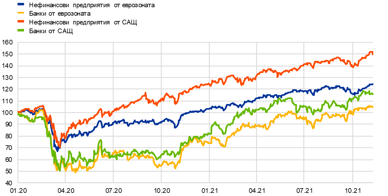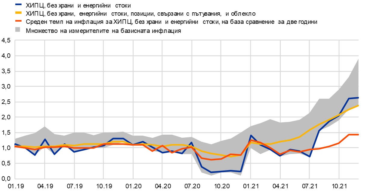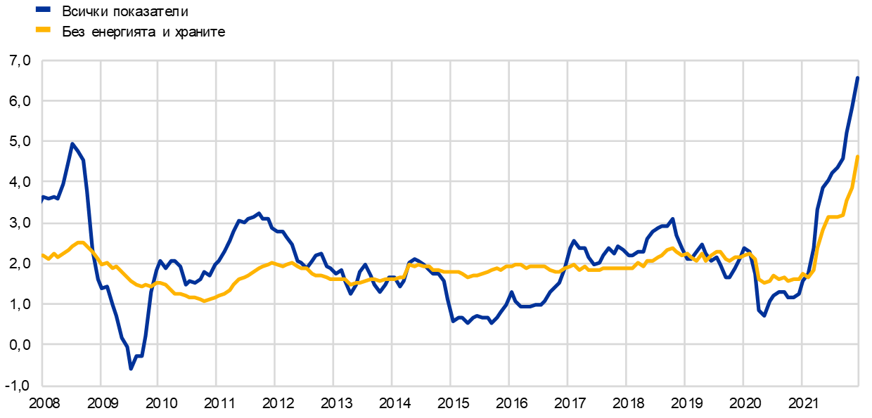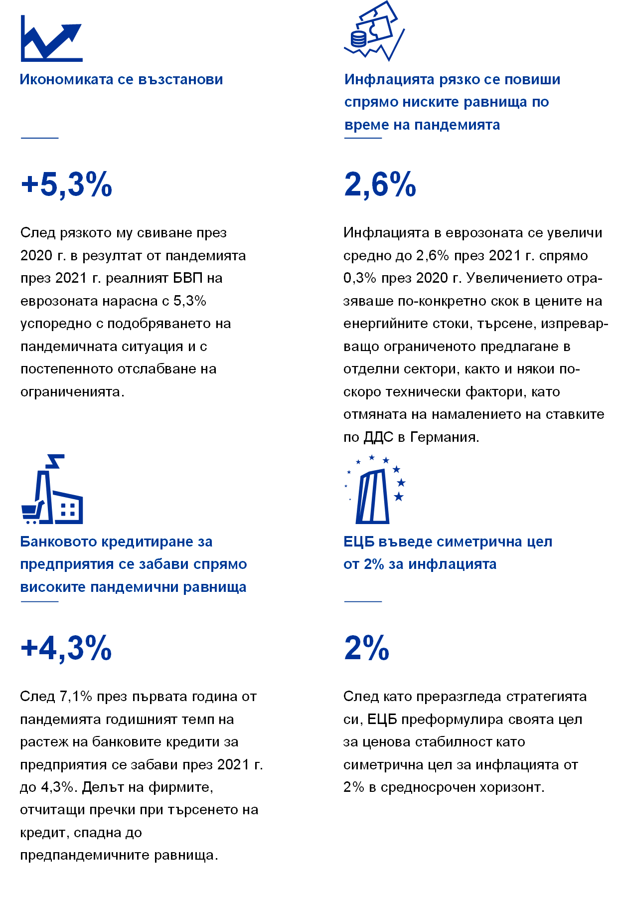 През 2021 г. световната икономика отбеляза значително възстановяване, най-вече поради отварянето на икономиките на фона на по-бързите темпове на ваксинация срещу COVID-19 и силните и навременни мерки за подкрепа. В развитите икономики и в икономиките с нововъзникващи пазари обаче възстановяването беше донякъде неравномерно. Инфлацията се повиши в световен мащаб, отразявайки главно рязкото поскъпване на енергийните стоки и търсене, изпреварващо предлагането в някои сектори предвид неблагоприятните фактори, породени от пандемията, както и други затруднения, свързани с доставките и транспорта. В еврозоната реалният БВП отбеляза силен растеж през 2021 г. след най-големия спад, регистриран през предишната година. Възстановяването, довело до подобряване на пазарите на труда, бе подпомогнато от своевременни и решителни мерки по паричната и фискалната политика. Въпреки това икономическата несигурност през годината остана повишена, а разликата между двата най-големи сектора – промишлеността и услугите, беше ясно изразена. В началото на годината растежът беше засегнат от карантинните мерки и ограниченията за пътуване, които се отразиха неблагоприятно върху предлагането и търсенето на услуги. По-късно, след извънредно силното възстановяване на търсенето в световен мащаб появата на трудности в предлагането и по-високите енергийни разходи ограничиха производството в промишлеността. Инфлацията в еврозоната, измерена чрез хармонизирания индекс на потребителските цени (ХИПЦ), рязко нарасна до 2,6% през 2021 г. спрямо 0,3% през 2020 г. През първите няколко месеца тя остана на ниски равнища, след което през годината се ускоряваше, като през декември достигна 5,0%. Скокът в цените се дължеше в голяма степен на рязкото и всеобхватно поскъпване на енергийните стоки, диспропорциите между търсенето и предлагането след отварянето на икономиките и на по-скоро технически фактори, като отмяната на временното намаление на ДДС в Германия. След края на 2021 г. инфлацията се очакваше да остане висока в краткосрочен хоризонт, а през 2022 г. да се забави. Нахлуването обаче на Русия в Украйна значително увеличи несигурността относно перспективите за инфлацията.