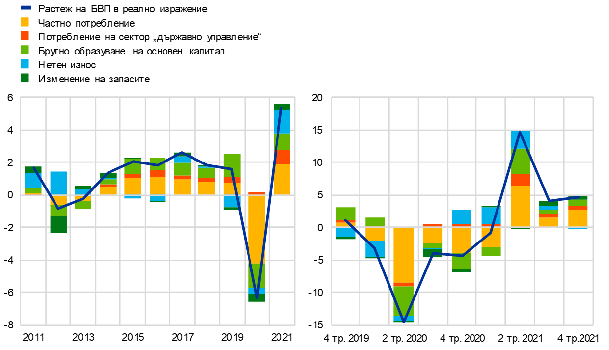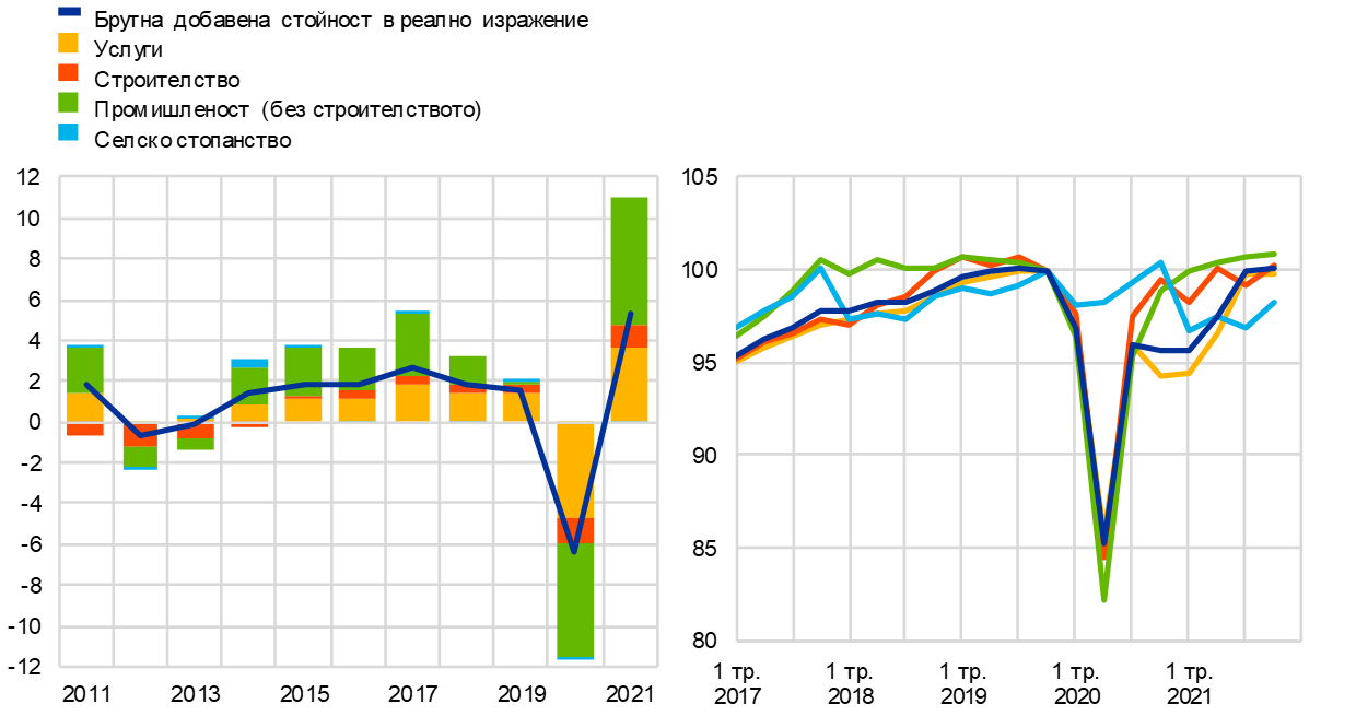 Забележка: Последните наблюдения са за 2021 г. (ляв панел) и за четвъртото тримесечие на 2021 г. (десен панел).