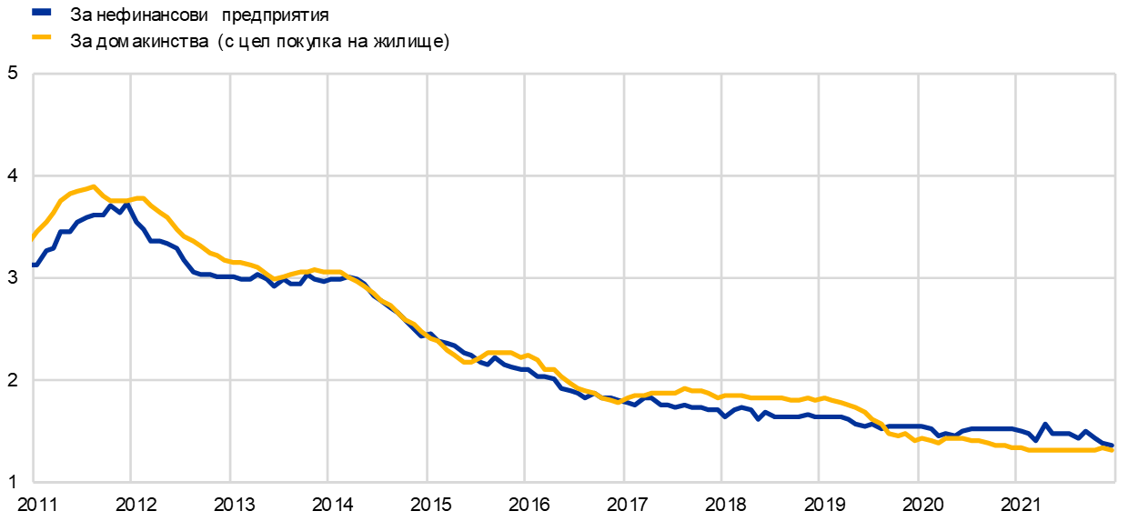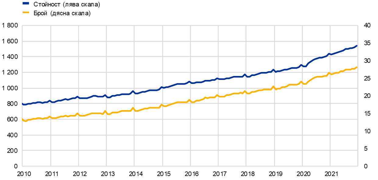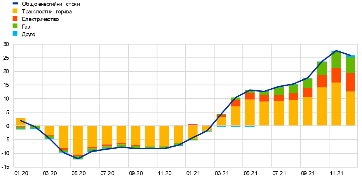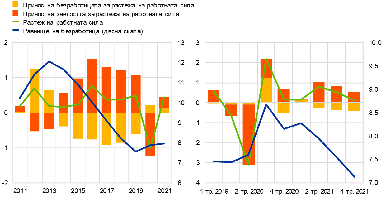 Забележка: Последните наблюдения са за 2021 г. (ляв панел) и за четвъртото тримесечие на 2021 г. (десен панел) и се базират на предварителни месечни данни.