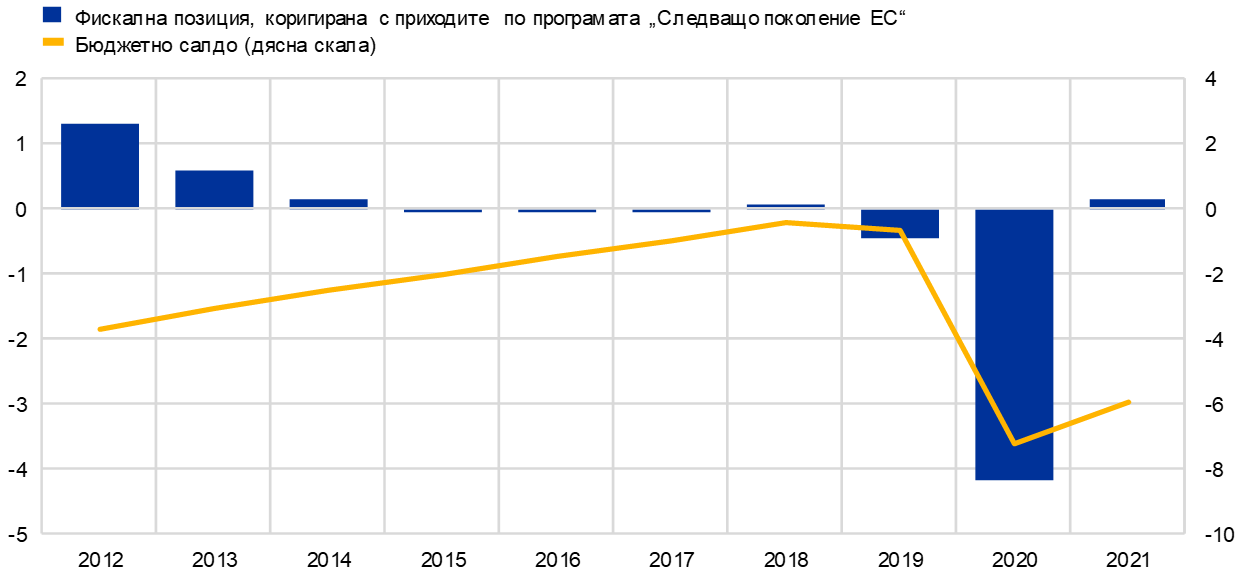 Забележка: Измерването на фискалната позиция отчита разходите, финансирани от Механизма за възстановяване и устойчивост по програмата „Следващото поколение ЕС“ и от други структурни фондове на ЕС (виж бележката под линия).