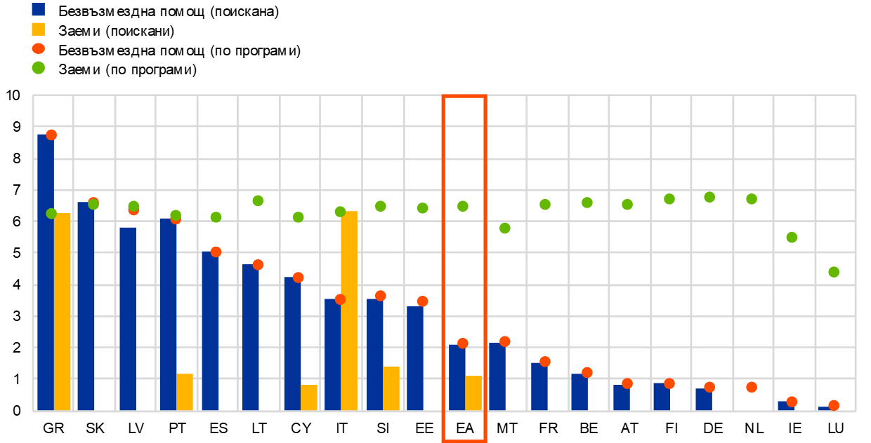 През последните две години правителствата се справяха с бюджетните нужди на първо място чрез националните политики, но все по-често – и чрез инициативи на равнище ЕС. Крайъгълният камък в общата политика на Европа в отговор на пандемията бе поставен през юли 2020 г., когато ЕС обяви програмата за инвестиции и реформи в ЕС „Следващото поколение ЕС“. Тя предвижда финансова подкрепа за държавите – членки на ЕС, в зависимост от изпълнението на конкретни проекти за инвестиции и реформи през периода 2021–2026 г. За тази цел е осигурено финансиране в размер до 807 млрд. евро по текущи цени, от които 401 млрд. евро (3,5% от БВП на еврозоната) са предназначени за държавите от еврозоната, а останалата част – за другите държави – членки на ЕС. Около половината от средствата по Механизма за възстановяване и устойчивост – най-мащабният инструмент по програмата „Следващото поколение ЕС“, се предоставят под формата на заеми, а половината – под формата на безвъзмездни средства. На практика обаче се очаква преобладаващ да бъде компонентът „безвъзмездни средства“, тъй като всички държави от еврозоната възнамеряват изцяло да се възползват от тях, докато кредити досега са поискали само няколко държави. Важна особеност на трансферите по Механизма за възстановяване и устойчивост е, че държавите, които са най-силно засегнати от пандемията или имат сравнително нисък БВП на глава от населението, имат право на по-голям дял (виж графика 1.12 относно разпределението по държави). По-конкретно, ако плановете за възстановяване и устойчивост се изпълняват добре, тази особеност би трябвало да допринесе за намаляване на различията в икономическия растеж между отделните държави, които в еврозоната се задълбочиха допълнително поради пандемията.